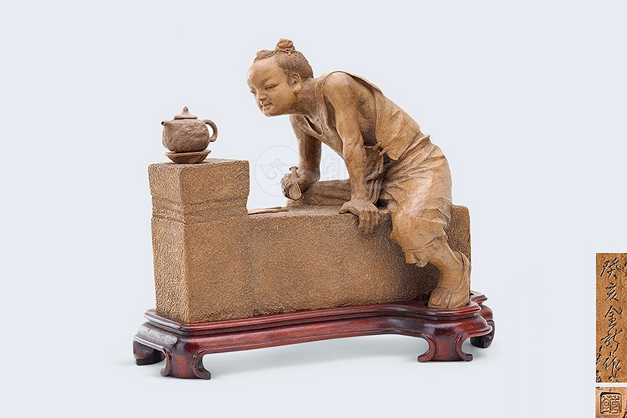 此件作品取材于“供春学艺”之典。供春生于明朝正德嘉靖年间,原为宜兴进士吴颐山的家僮。吴颐山读书于金沙寺时,供春利用侍候主人的空隙时间,仿老僧制壶,制成树瘿壶,寺僧叹服,后以制紫砂壶为业,世称“供春壶”。