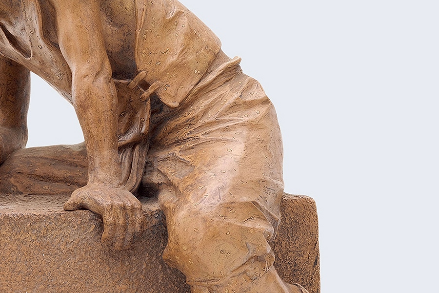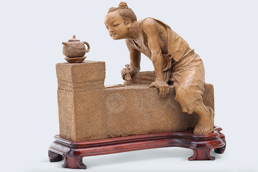 此件作品表现的正是供春制壶的过程,人物面部表情极为细腻,俯身探首的瞬间动态把握精准。塑像中的供春小壶为徐汉棠精心塑就,小巧玲珑,微妙精致,匠心巧手,令人观之动容。