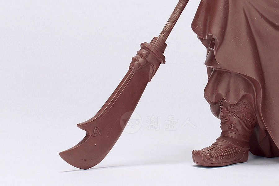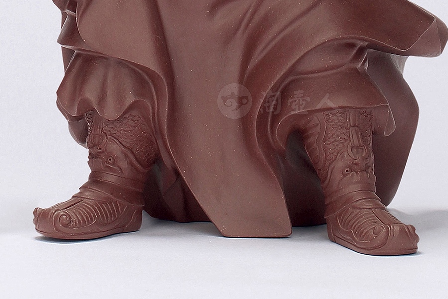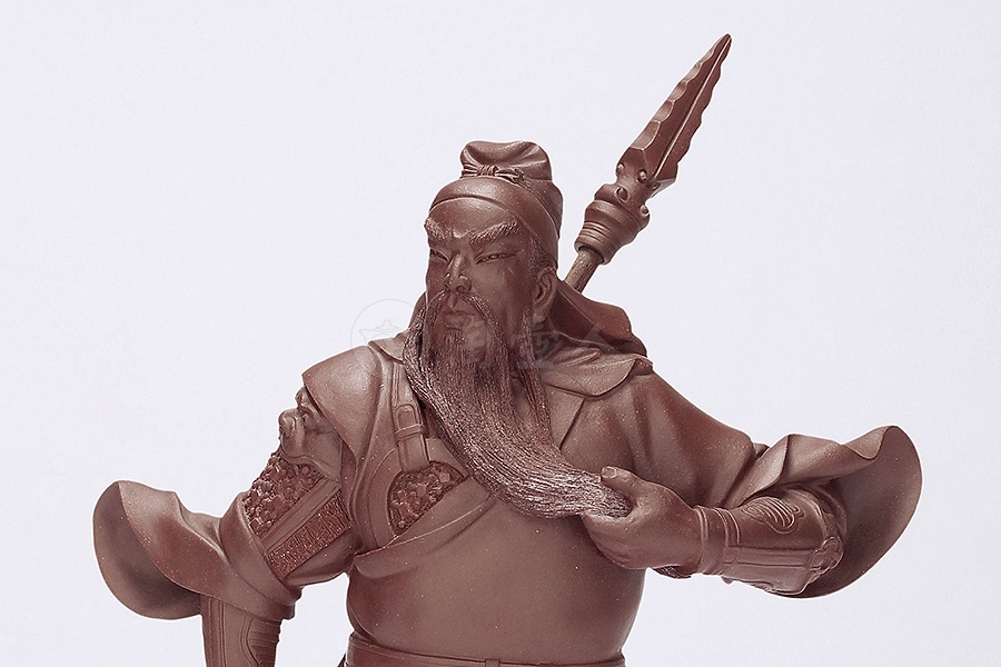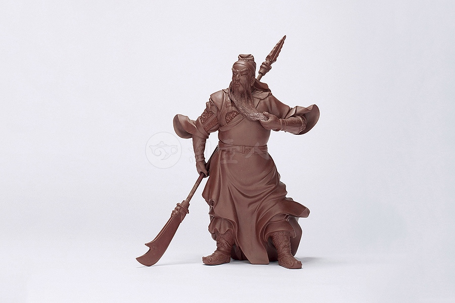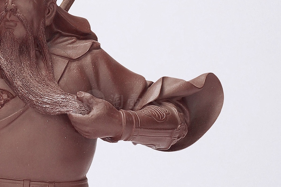 此紫砂雕塑作品以历史人物为对象,设计创作紫砂作品。关公,即是家喻户晓的三国时期蜀汉名将关羽。关羽(?-220年),字云长,河东解良(今山西运城)人,早期跟随刘备辗转各地,曾被曹操生擒,于白马坡斩杀袁绍大将颜良,与张飞一同被称为万人敌。关公在其近六十年的一生中,策马横刀,驰骋疆场,征战群雄,辅佐刘备完成鼎立三分大业,谱写出一曲令人感慨万端的人生壮歌,被后人推举为“忠”“信”“义”“勇”集于一身的道德楷模,并成了中国封建社会后期上至帝王将相,下至士农工商广泛顶礼膜拜的神圣偶像。关公文化是一种汉族民间信仰。武圣关公庙在海内外数量及规模远远超过了孔子的文庙。徐秀棠大师以紫砂雕塑塑造的关公,威武庄严,战袍衣褶富有变化,他左手抚美髯,右手持长刀,脚蹬长靴,身着的战袍虎虎生威,宽大的袖口富有动感,增添了人物的生气。面对关公塑像,信义之士,令人心生尊敬。