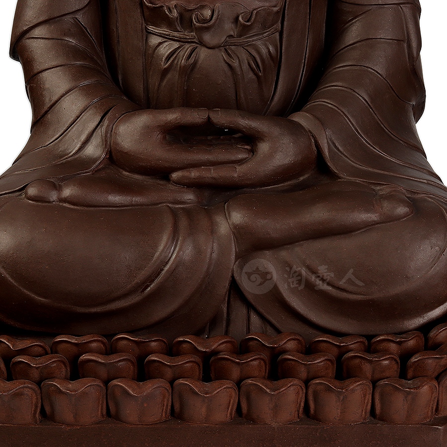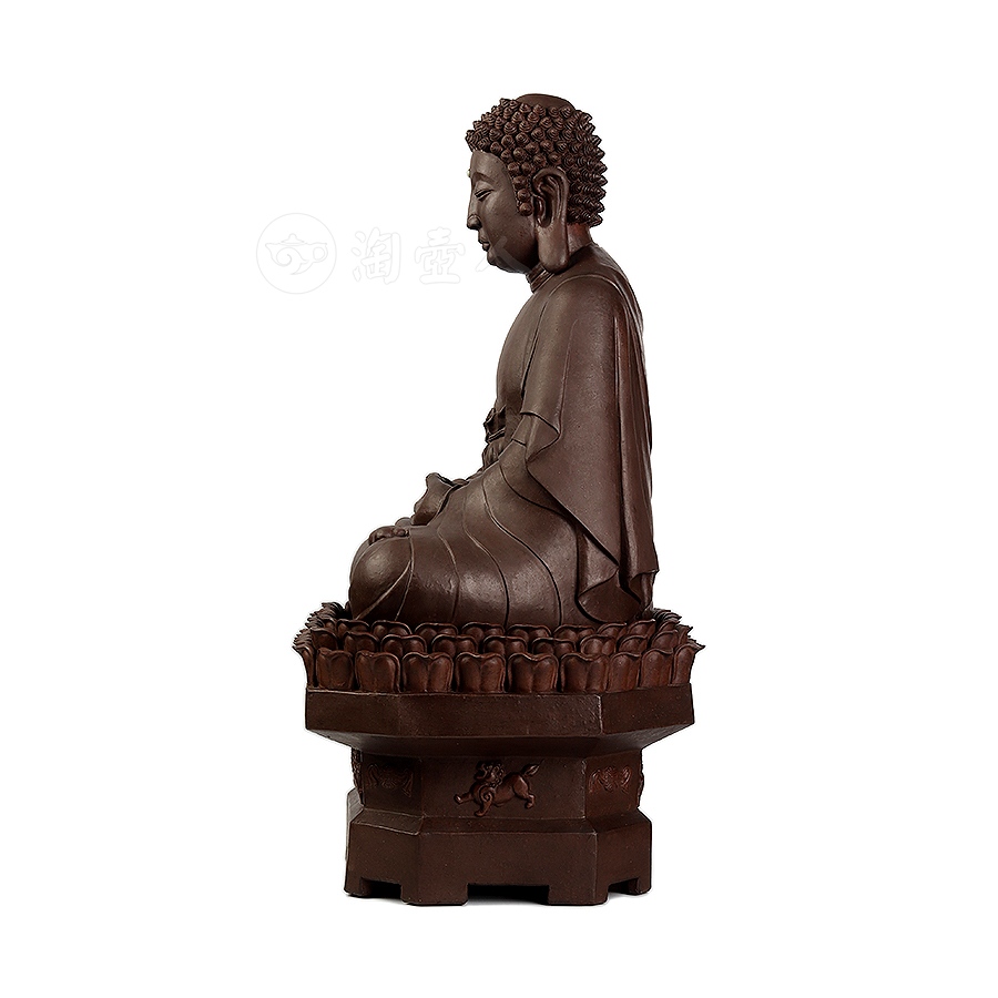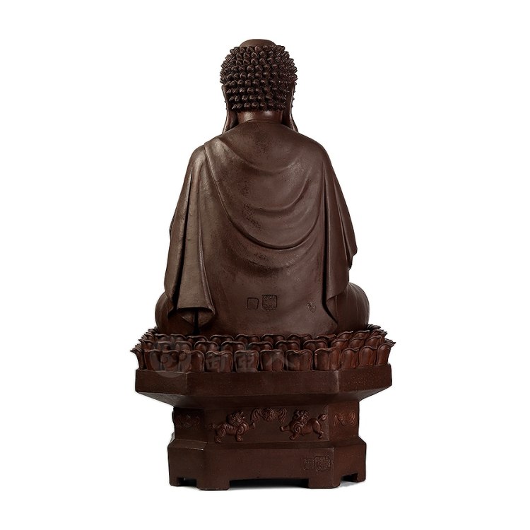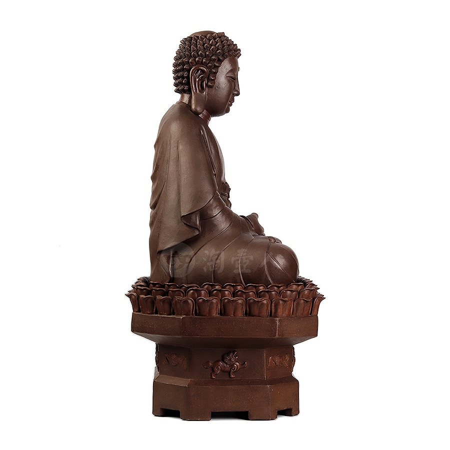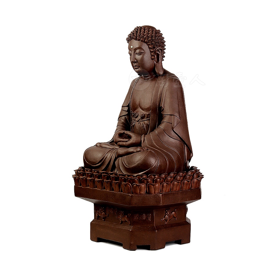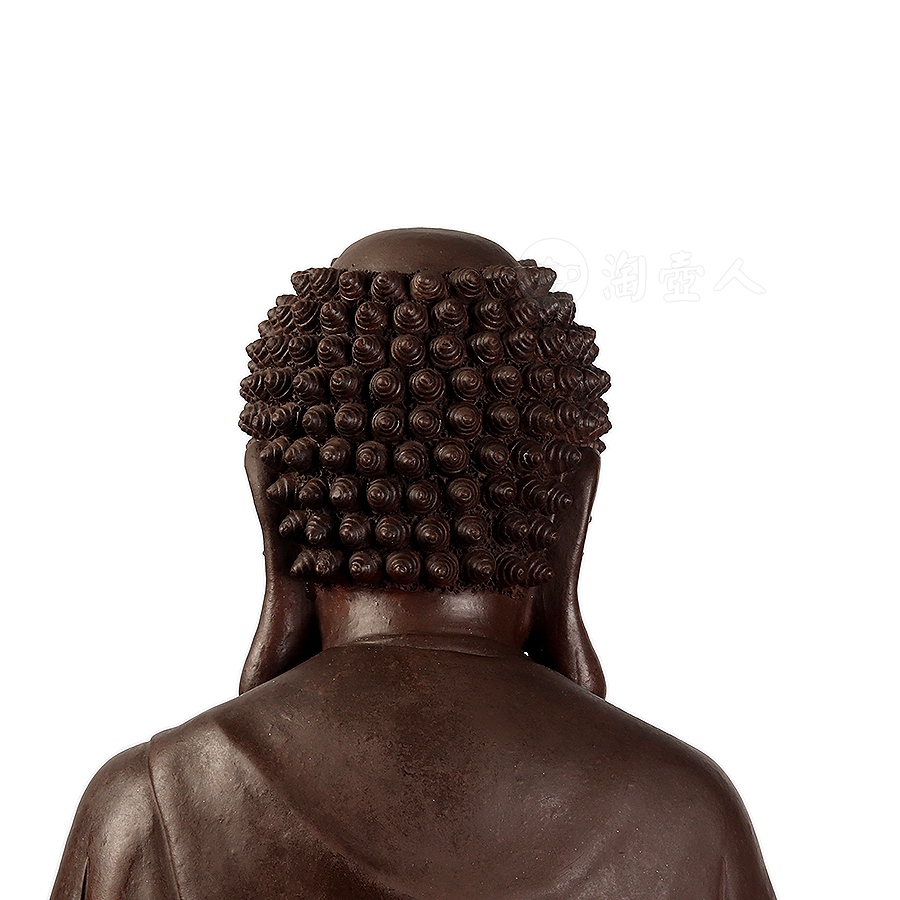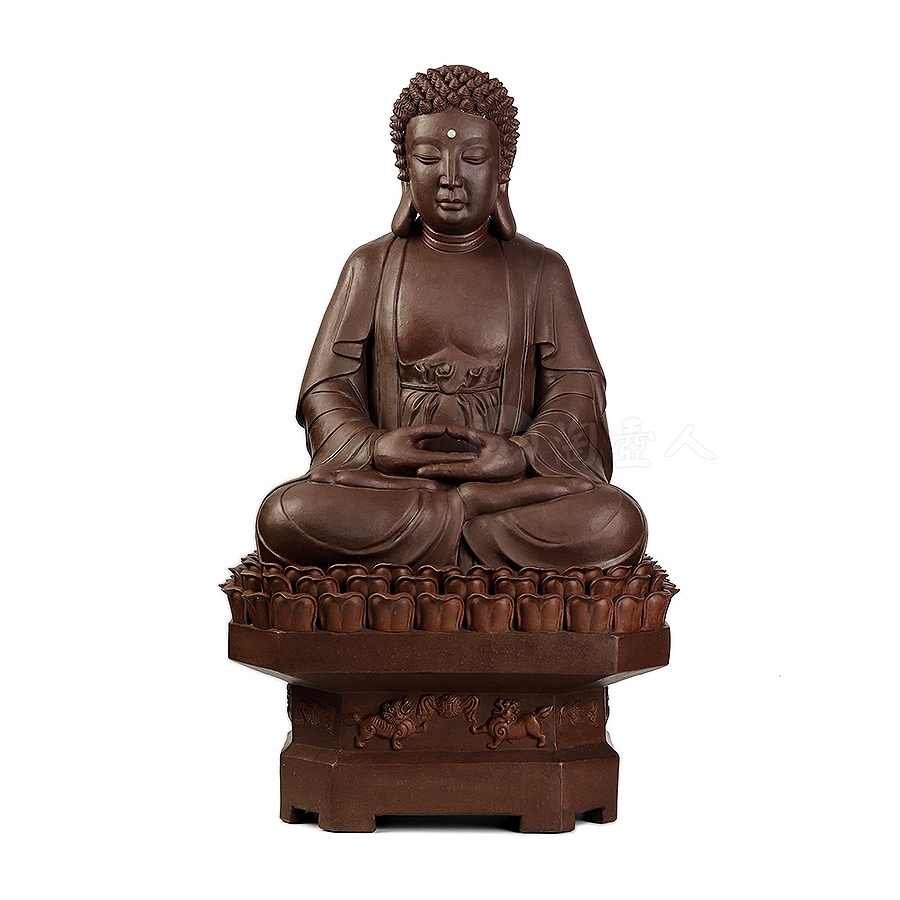此件大日如来塑像,采用一厂粗砂老紫泥创作于90年代,摹师父徐秀棠大件大日如来经典,作缩小处理,并由徐秀棠大师亲自监制。大日如来头顶螺发,大耳垂肩,半披袈裟,袒露前胸,盘坐于莲花宝座之上,双手结法界定印,闭目参禅。