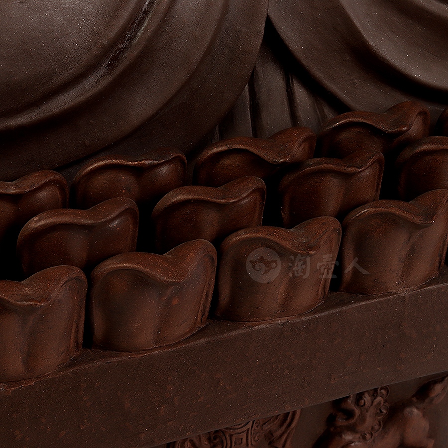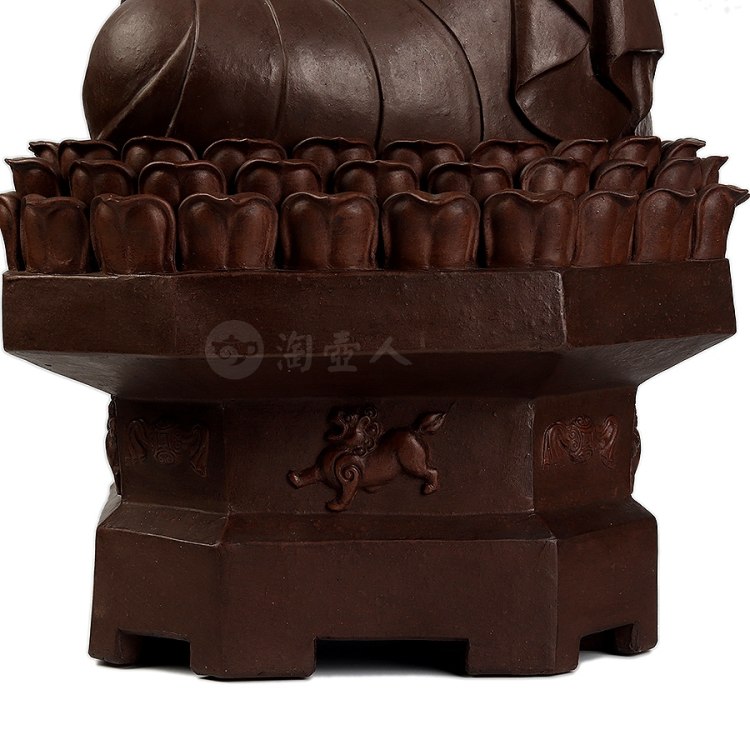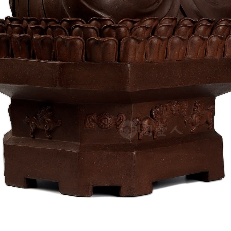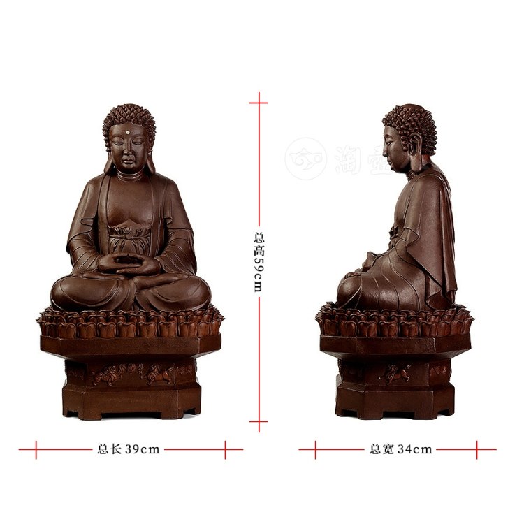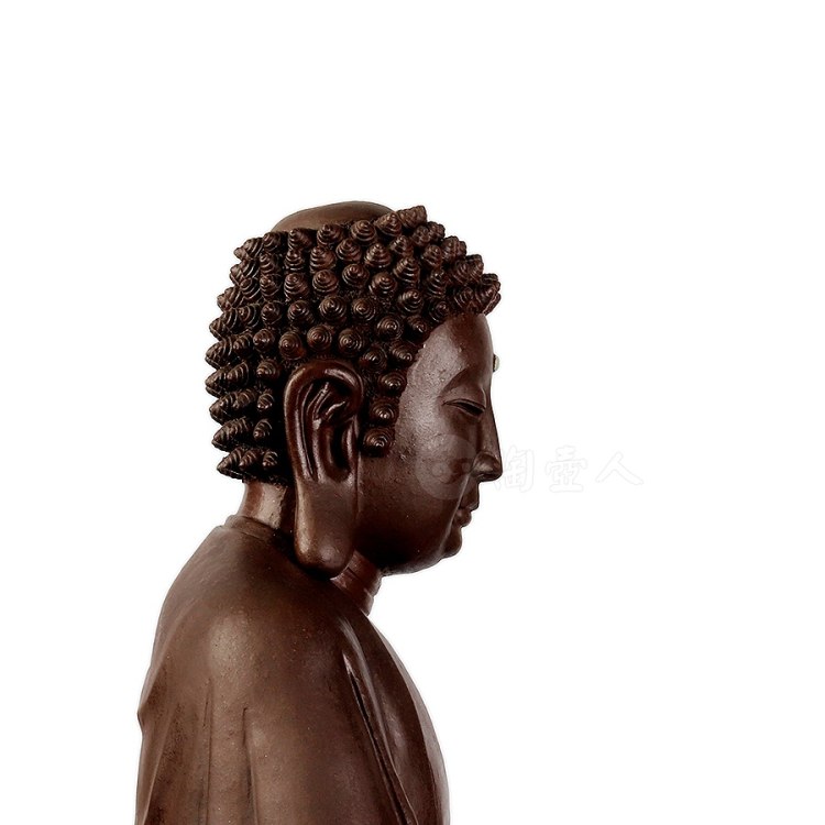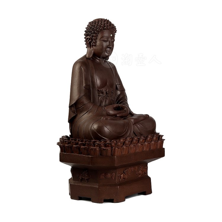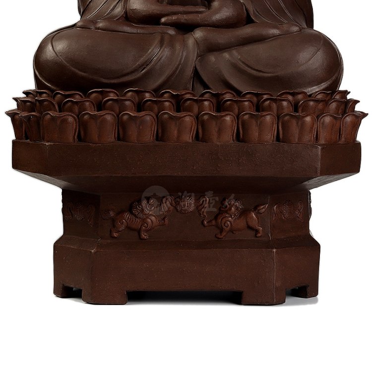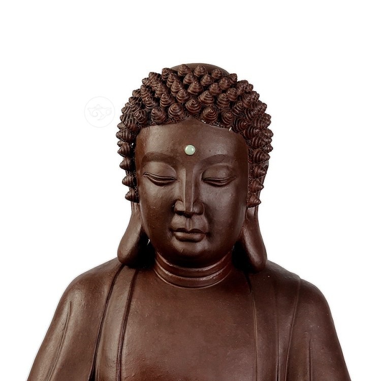 此件大日如来塑像,采用一厂粗砂老紫泥创作于90年代,摹师父徐秀棠大件大日如来经典,作缩小处理,并由徐秀棠大师亲自监制。大日如来头顶螺发,大耳垂肩,半披袈裟,袒露前胸,盘坐于莲花宝座之上,双手结法界定印,闭目参禅。
