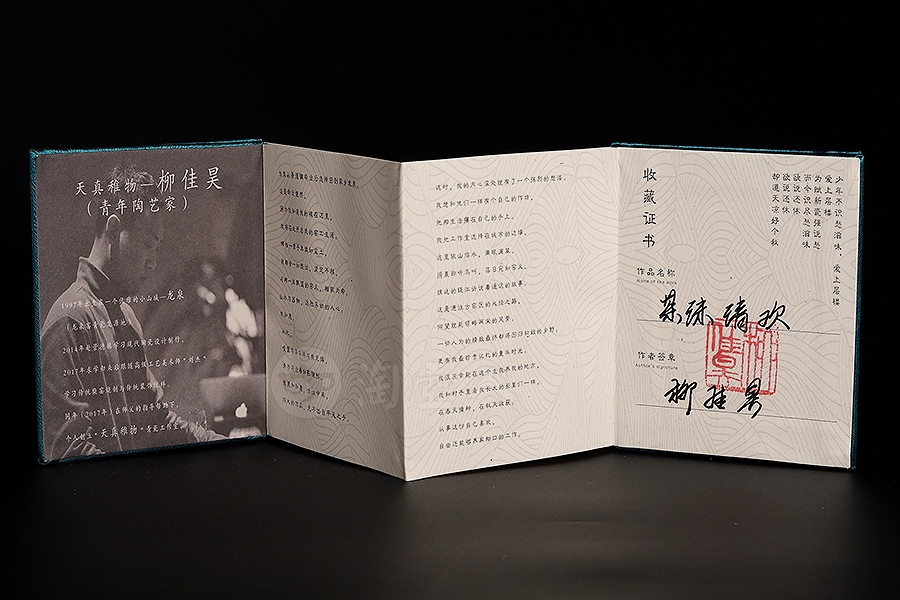 柳佳昊,男,1997年生于浙江龙泉,2014年毕业于龙泉中职校青瓷专业,同年赴景德镇学习现代陶瓷设计制作。2017年求学归来,跟随刘杰学习传统柴窑烧制技艺,同年在师傅刘杰的帮助下创办个人工作室“天真稚物”。作品古朴自然,明净简洁。以古瓷标本为师,潜心研习釉水与烧制工艺。