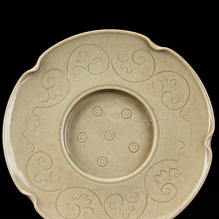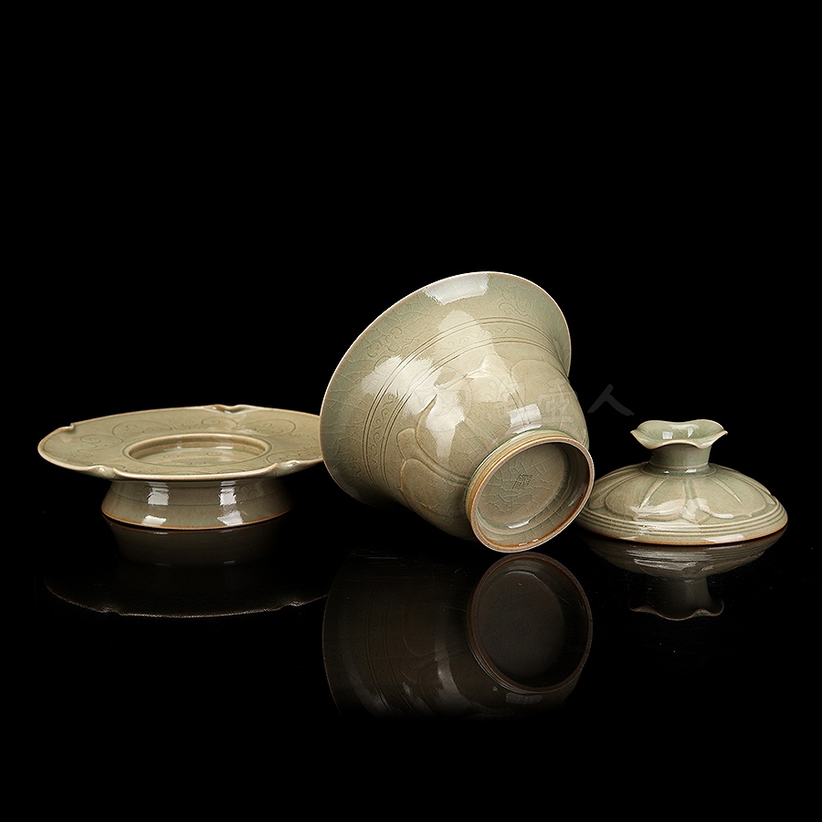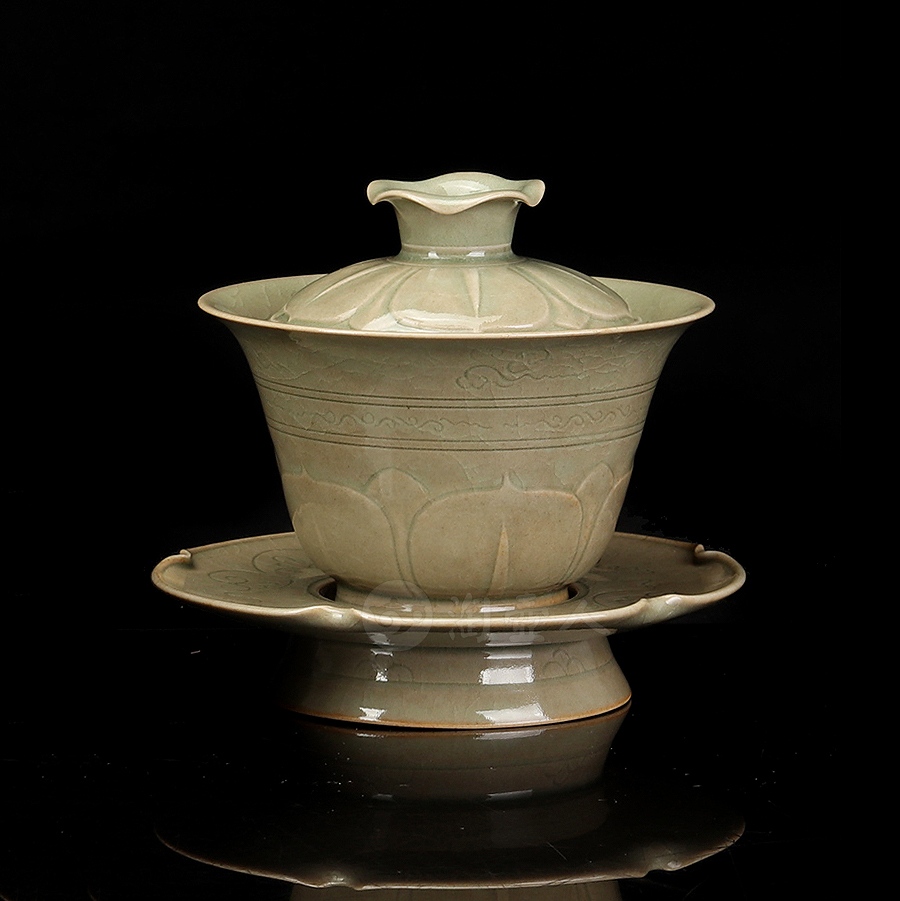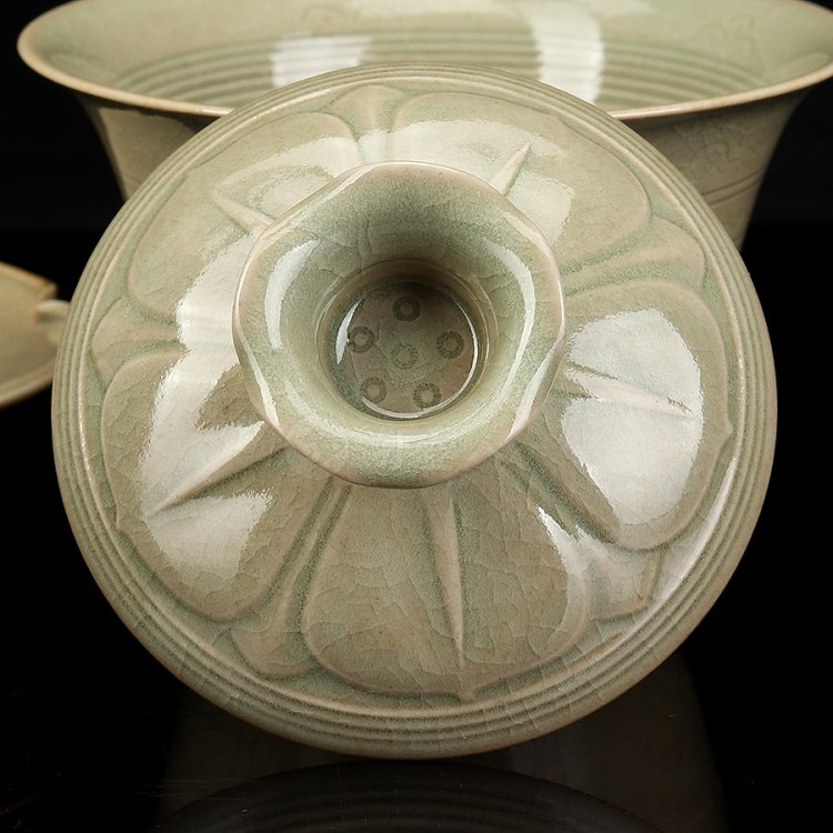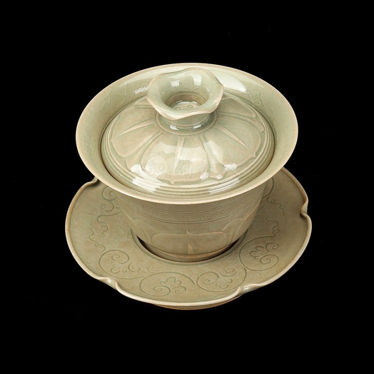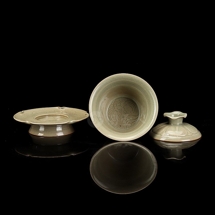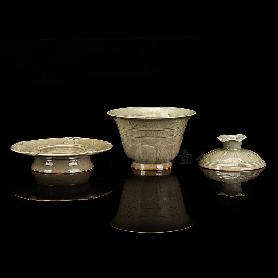 盖面、碗身全手雕刻双重莲瓣纹,并适当装饰弦纹、缠枝纹为辅,层次丰富,意趣盎然。茶托平且薄,高圈足微微外撇,中部内凹,恰好与碗之圈足相契,放置平稳,边沿向上翻折,如同莲叶托起茶碗,内壁环刻缠枝纹装饰。