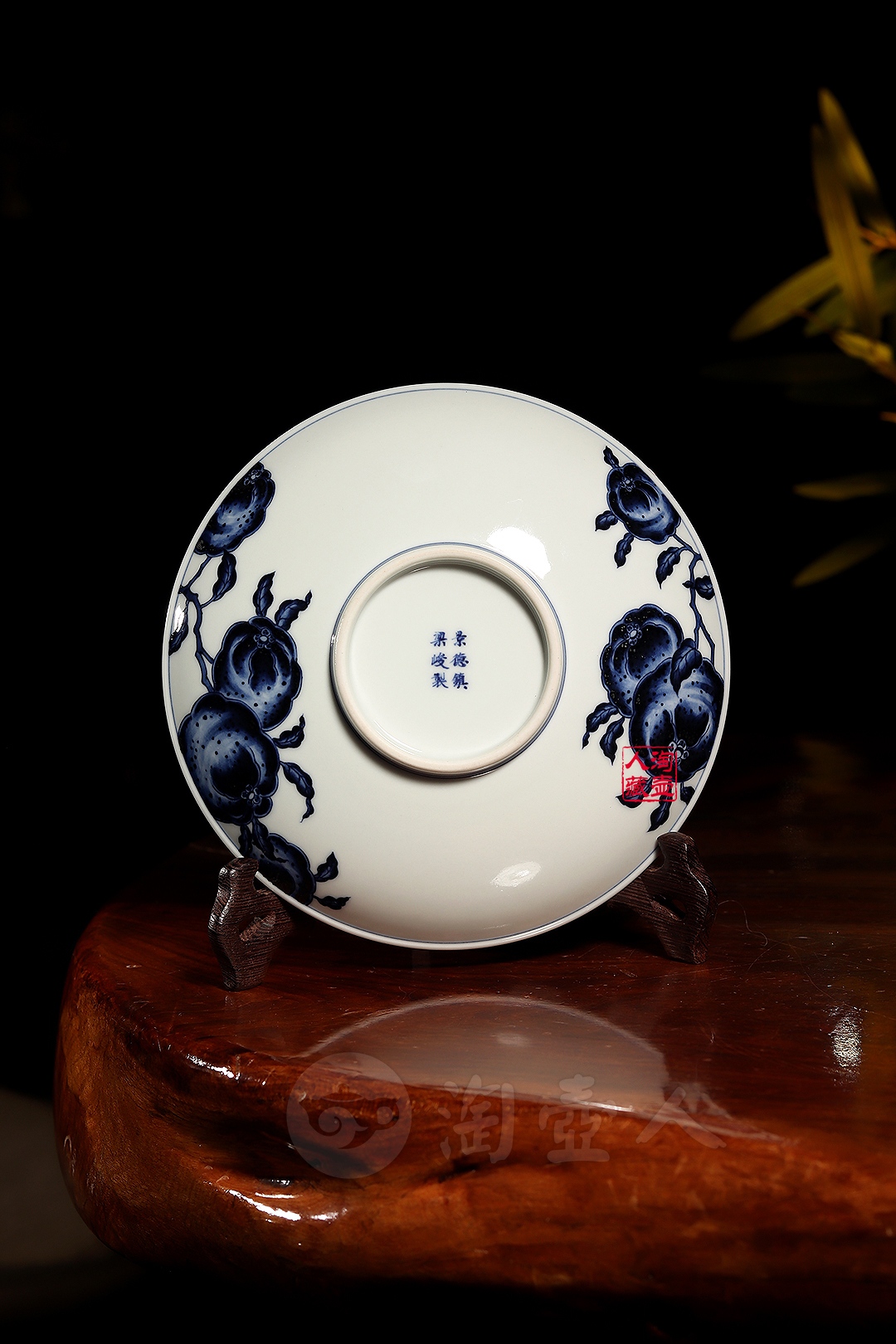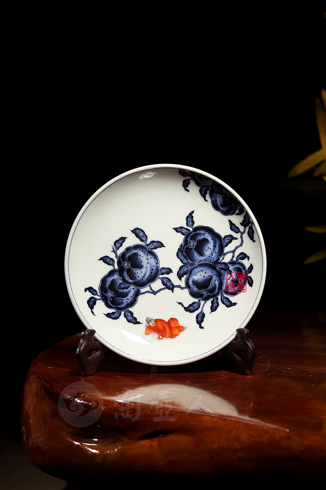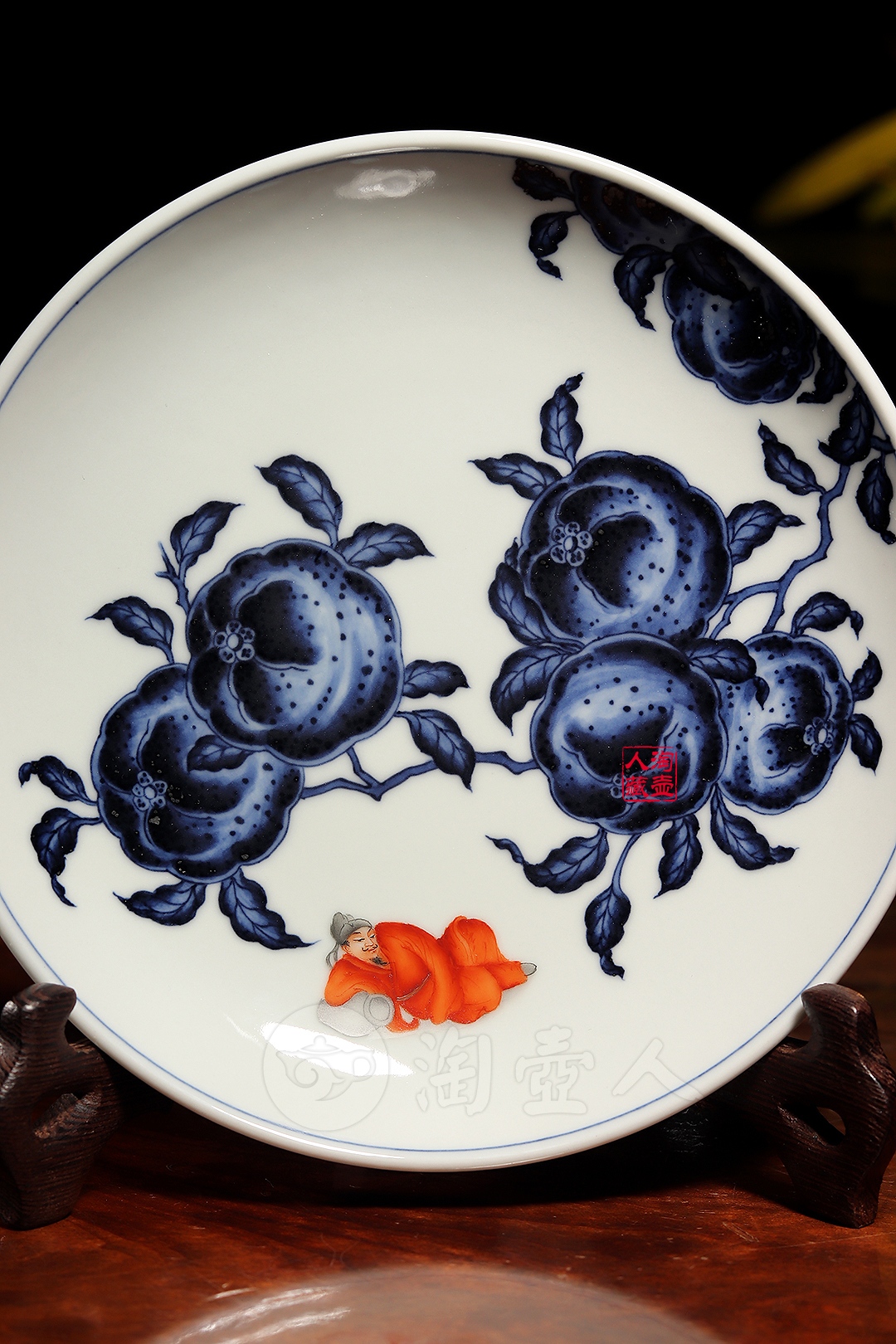 此件局外人李白壶承,胎质洁白细腻,釉面柔和莹润,撇口浅腹,圈足规整,器型简洁大方,装饰上融合了青花与矾红两大传统工艺,青花绘制的橘子为画面主体,橘果饱满硕大,橘皮纹理逼真,色彩浓淡相宜,层次感十足。