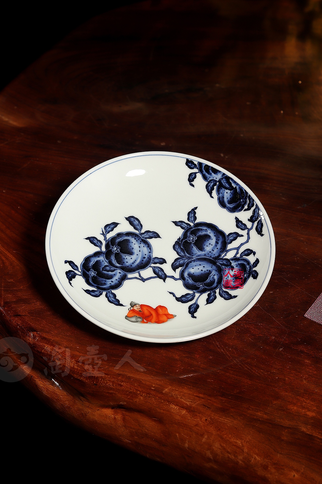 更以名士李白形象入画,矾红彩描绘的李白尤为醒目,侧卧于树下,神情悠然自得,将其豪放不羁、淡泊洒脱的性格特质展现得淋漓尽致。青花清丽,矾红明艳,相互映衬,整个画面干净利落,风格突出,尽显中式器物的独特魅力与深厚文化底蕴。