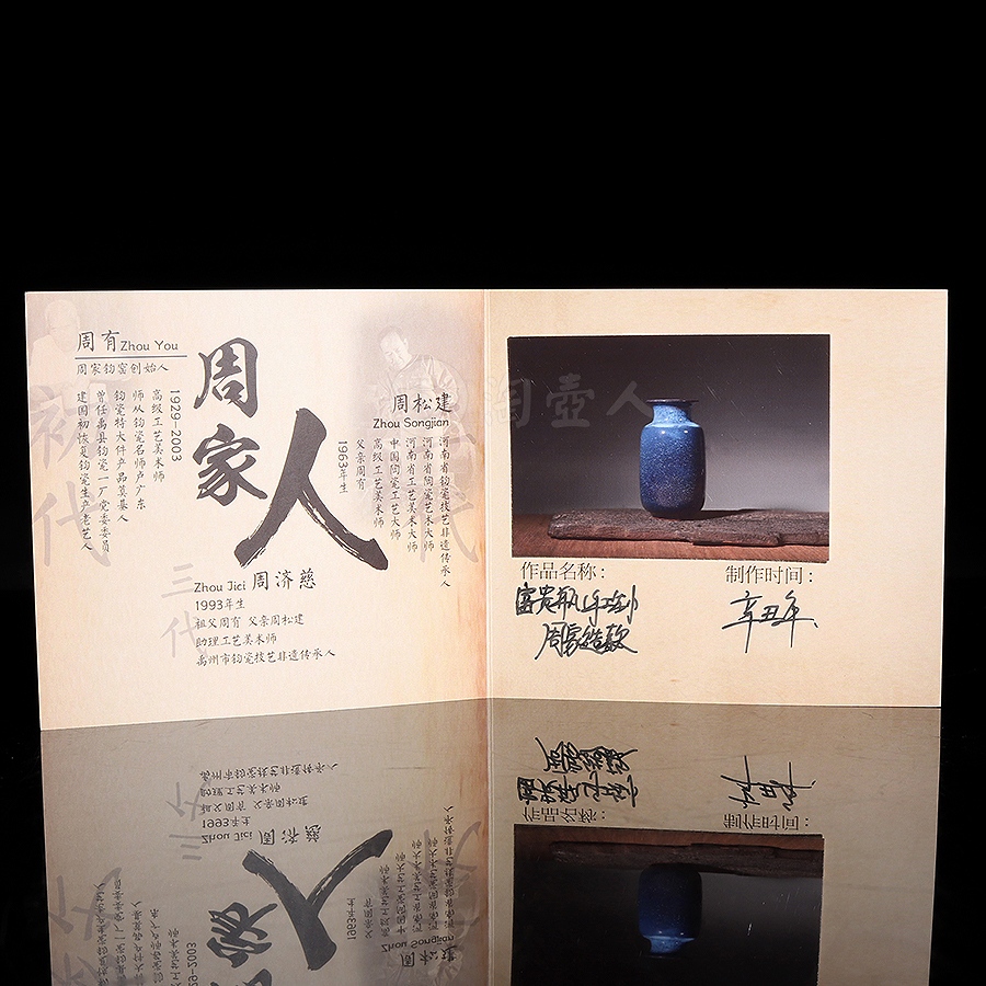 周松建,又名周剑,1963年出生身于制瓷世家,河南省工艺美术大师、河南省陶瓷艺术大师,河南省钧瓷烧制技艺非物质遗产项目代表传承人,其父是著名钧瓷艺人周有。1982年进入禹县钧瓷一厂工作,从事钧瓷的制作和烧成。周松建在鹦哥绿的基础上,加入其他矿物,研制出了以鹦哥绿为基础色调,绿中透红,红色斑驳的釉色,并命名为“翡翠飘红”。他的作品造型大气美观,釉色独特,其作品先后被人民大会堂、全国政协、毛主席纪念堂、全国妇女联合会收藏。他烧制的钧瓷作品《怀柔天下》更是被选为国礼,赠送给联合国副秘书长阿沙罗斯米基罗。