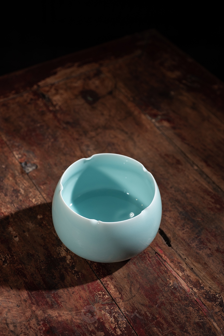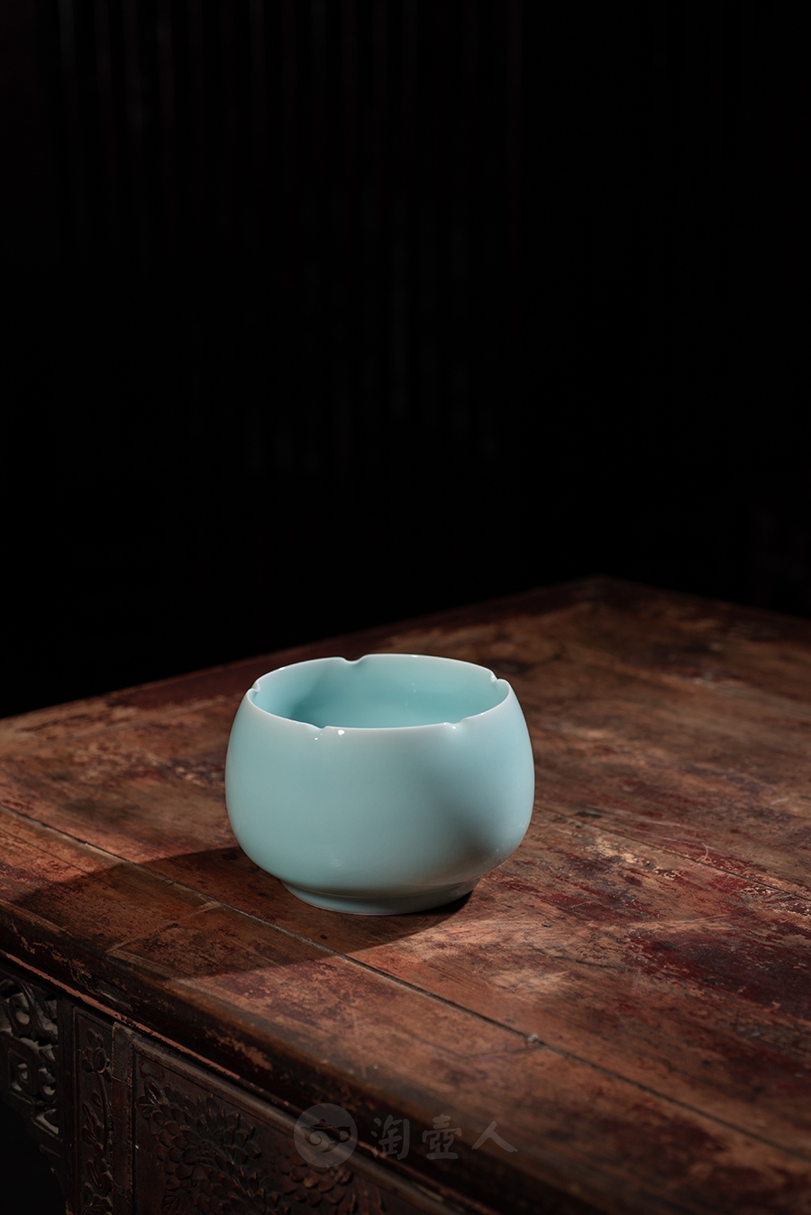 《蕾·水洗》是徐象龙老师根据葵花洗造型创新演变而来。洗呈未绽放的花蕾式,洗腹由上之下渐收至洗底,洗心微向内凸起,加足底圈足。通体施粉青釉,釉汁厚润,釉面温润如玉。此洗造型玲珑小巧,典雅可爱,是徐象龙老师的精品之作。