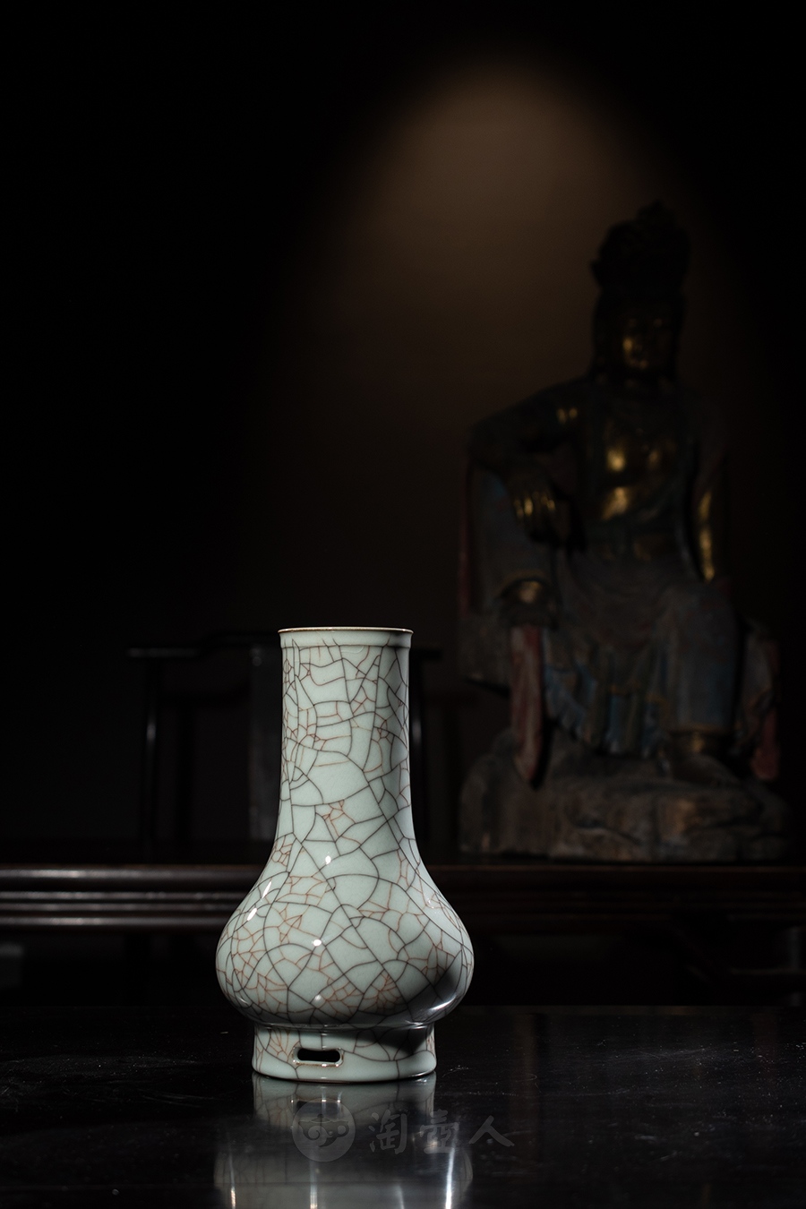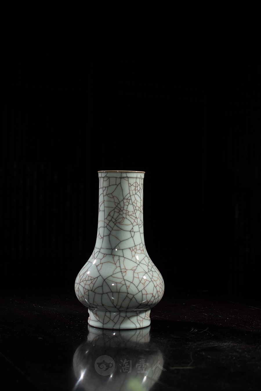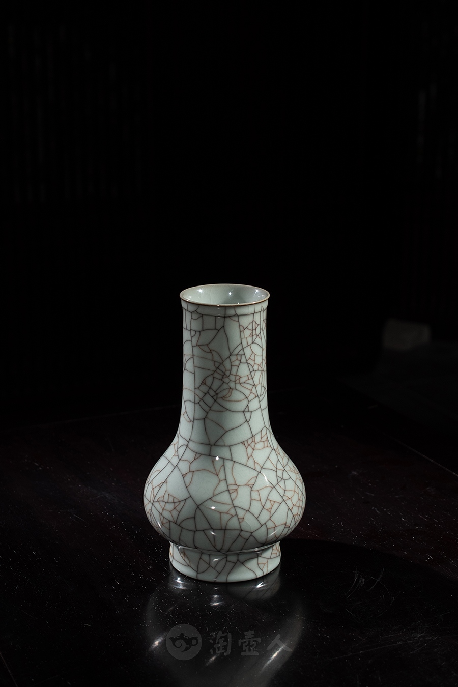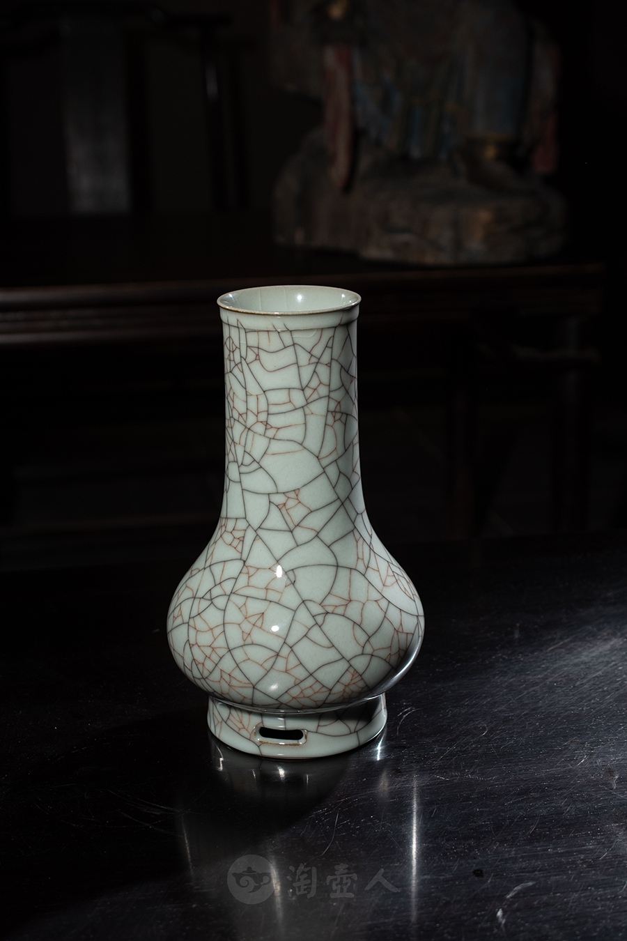 此穿带瓶为直口直颈,瓶腹略鼓,加足底。釉面玻化程度较高,釉质莹润,通体釉面被纹线交织切割。