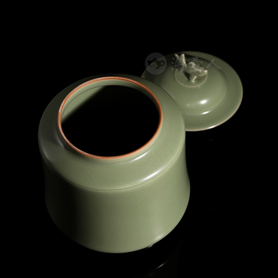 此件鱼跃瓯红罐,为朱砂胎通体施青釉,釉色纯正莹润,足底露胎,呈赭红色。罐体高挺,丰敛合度,为经典将军罐造型,罐盖边沿平展而中心渐隆,恰似一顶将军盔帽。