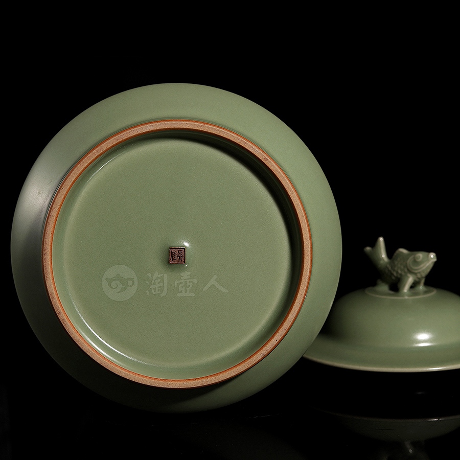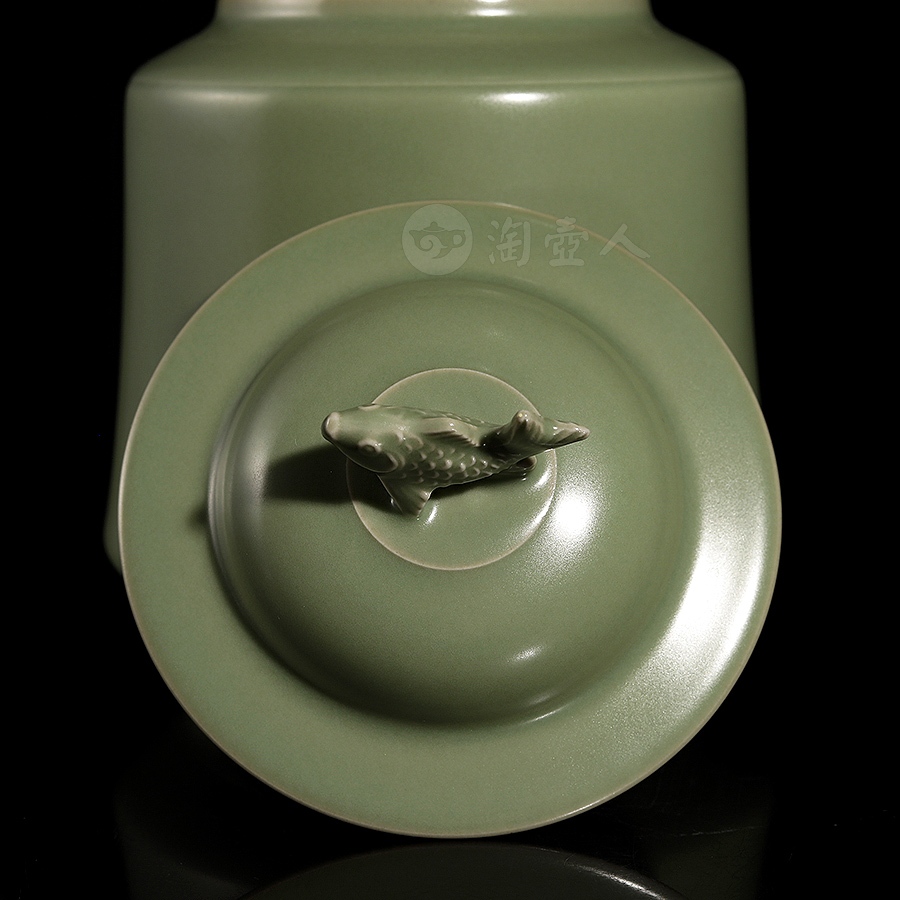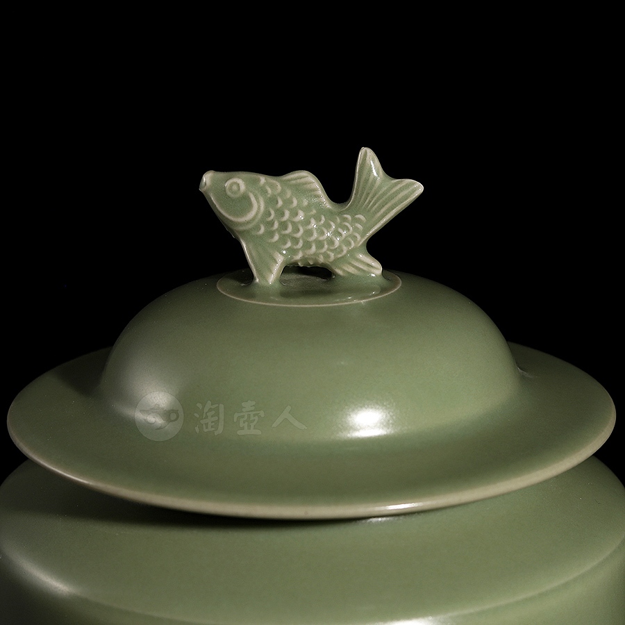 整器点睛之处在于盖上钮的设计,此鱼钮乃是以元代龙泉窑青釉鱼形砚滴(现藏于韩国国立博物馆)为原型,缩小处理设计而成,鲤鱼昂头翘尾,鱼身暗刻鱼鳞,胸鳍、腹鳍外展作钮基与盖面衔接,工艺精湛,摹形生动,且隐含鱼跃龙门之吉祥寓意。