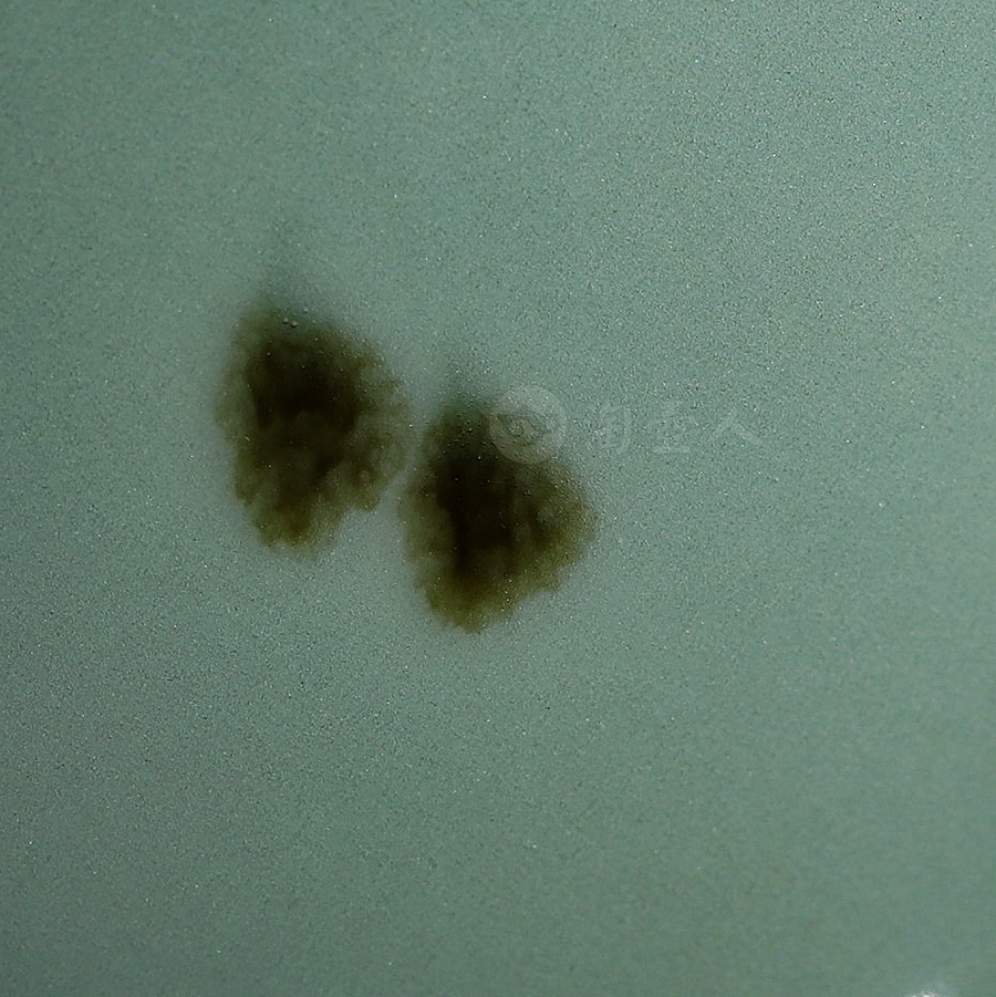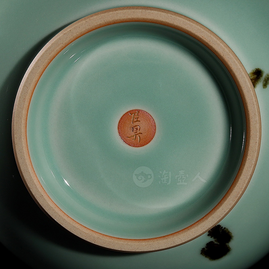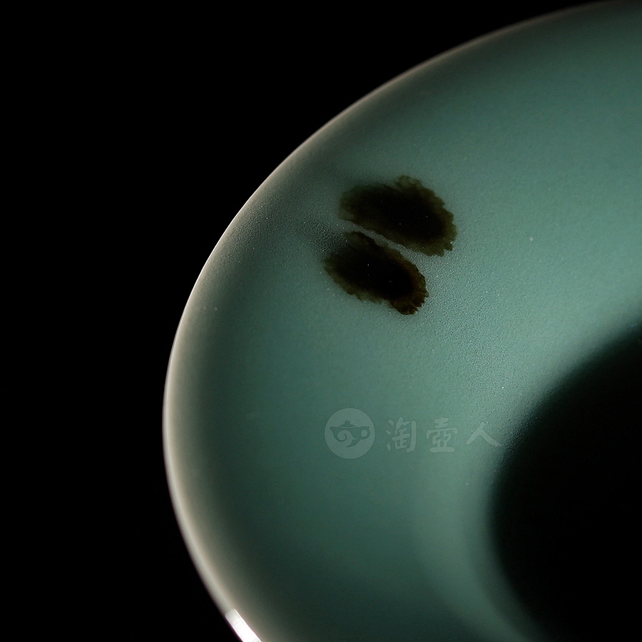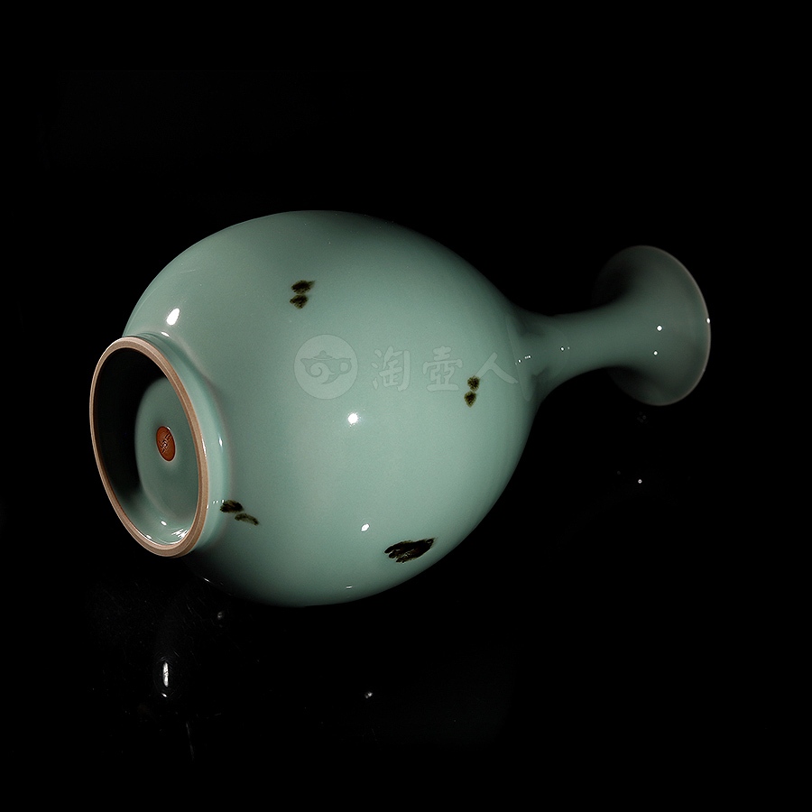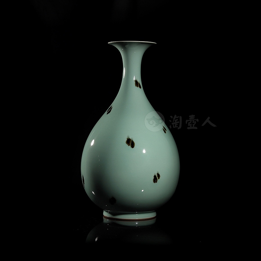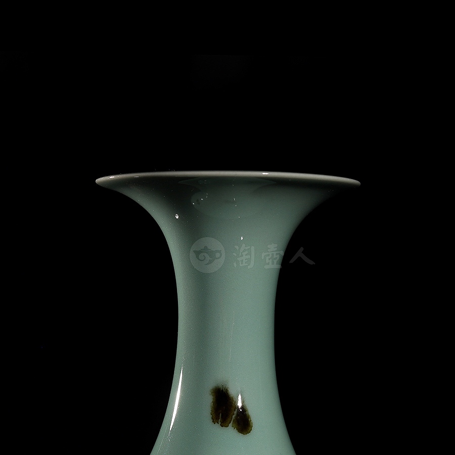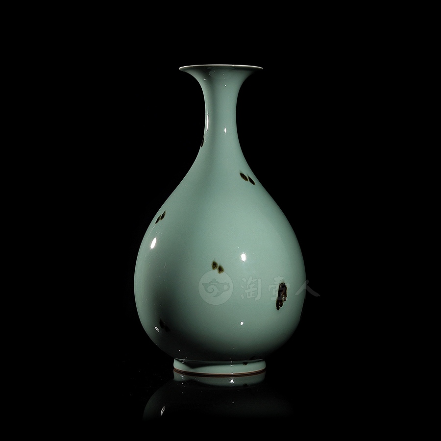 此件大型玉壶春瓶,临摹宋代经典,撇口束颈,颈部纤细,垂腹圆鼓丰腴,整体似一滴坠落的水珠,上下比例悬殊,然线条过渡流畅,更显优美而舒朗。瓶身以点彩(亦称“飞青”)工艺装饰褐斑点点,极具审美意趣。