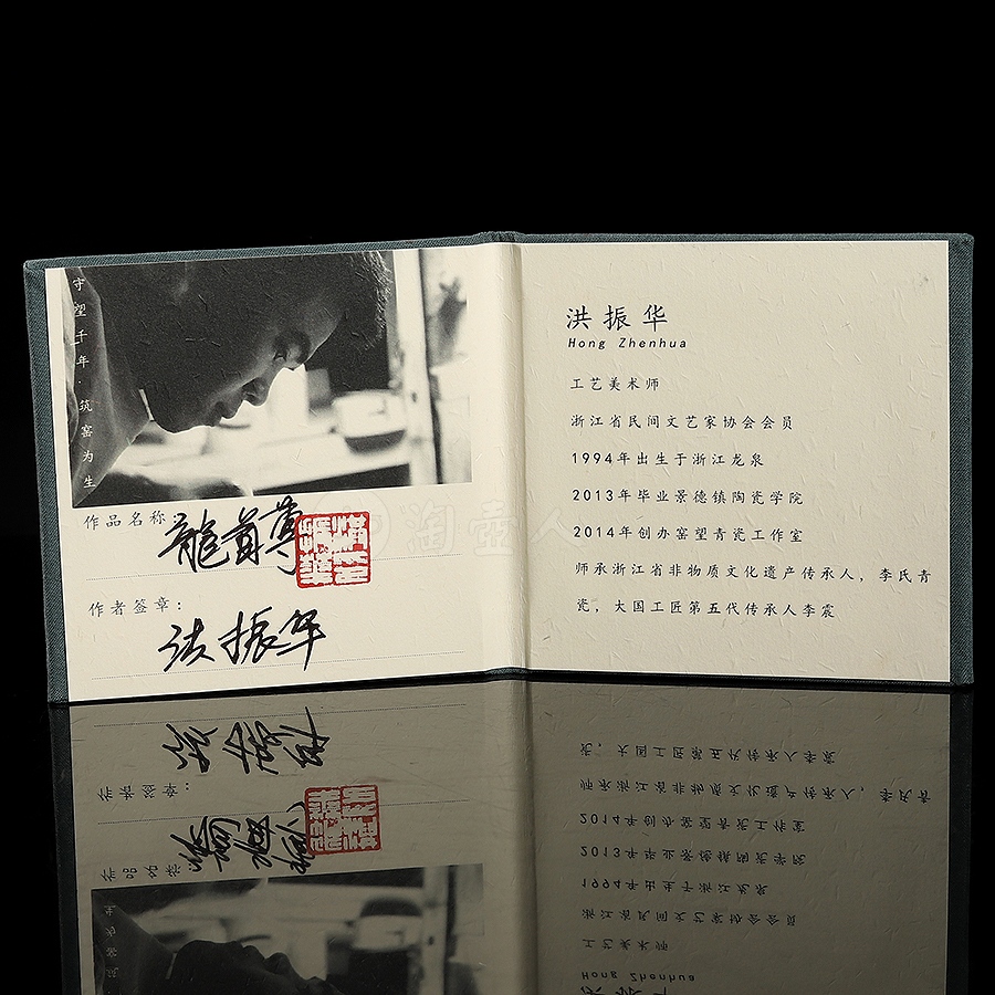 洪振华,1994年生于龙泉,工艺美术师,年轻辈青瓷新秀,江苏省民间文艺家协会会员,擅长摹古薄胎粉青釉,2013龙泉市中职校陶瓷工艺专业毕业,师承浙江省非物质文化遗产传承人李震。开始专注制作青瓷工作,潜心研制,学习传统,融合新的技术,洪振华的作品也在制作中逐渐成熟,形成了自己独树一帜的风格。在制作青瓷的这些年中获得了不少成就和认可,所制作品多次参赛获奖。