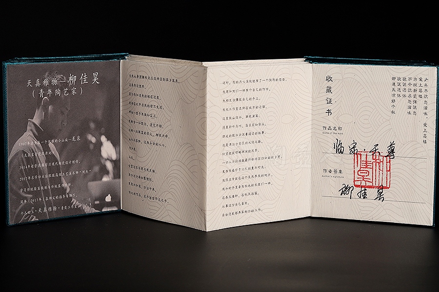 柳佳昊,男,1997年生于浙江龙泉,2014年毕业于龙泉中职校青瓷专业,同年赴景德镇学习现代陶瓷设计制作。2017年求学归来,跟随刘杰学习传统柴窑烧制技艺,同年在师傅刘杰的帮助下创办个人工作室“天真稚物”。作品古朴自然,明净简洁。以古瓷标本为师,潜心研习釉水与烧制工艺。
