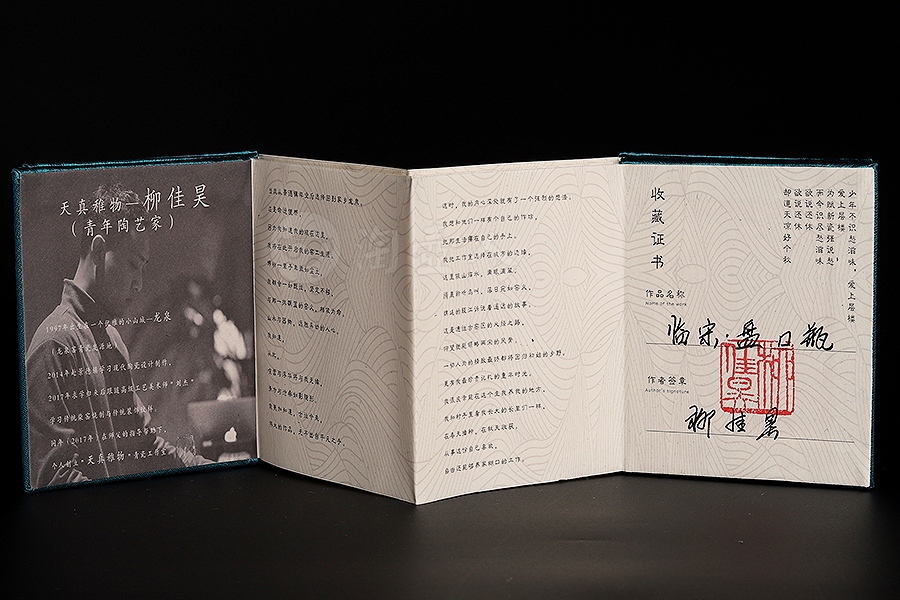 柳佳昊,男,1997年生于浙江龙泉,2014年毕业于龙泉中职校青瓷专业,同年赴景德镇学习现代陶瓷设计制作。2017年求学归来,跟随刘杰学习传统柴窑烧制技艺,同年在师傅刘杰的帮助下创办个人工作室“天真稚物”。作品古朴自然,明净简洁。以古瓷标本为师,潜心研习釉水与烧制工艺。