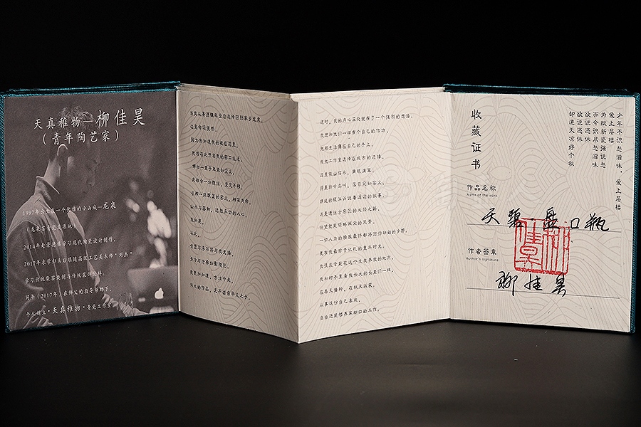 柳佳昊,男,1997年生于浙江龙泉,2014年毕业于龙泉中职校青瓷专业,同年赴景德镇学习现代陶瓷设计制作。2017年求学归来,跟随刘杰学习传统柴窑烧制技艺,同年在师傅刘杰的帮助下创办个人工作室“天真稚物”。作品古朴自然,明净简洁。以古瓷标本为师,潜心研习釉水与烧制工艺。