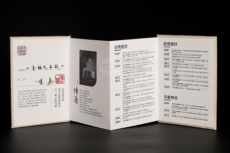 陈勇,1984年出生于浙江龙泉,高級工艺美術師、浙江省工艺美术大师,浙江省陶艺术大师、龙泉非物质文化遗产“龙泉青瓷烧制技艺”传承人、丽水市五养特色技能大师、丽水市绿谷新秀、丽水市重点文化“创新团队”带头人。2004年毕业于浙江省龙泉市高等职业学校,毕业后师从浙江省工艺美术大师陈爱明学习龙泉青瓷造型设计,传统手拉坯技艺和“跳刀”纹饰、“印叶”纹饰等现代陶瓷艺术。经过不断的努力与学习,并取得了一定的成绩。