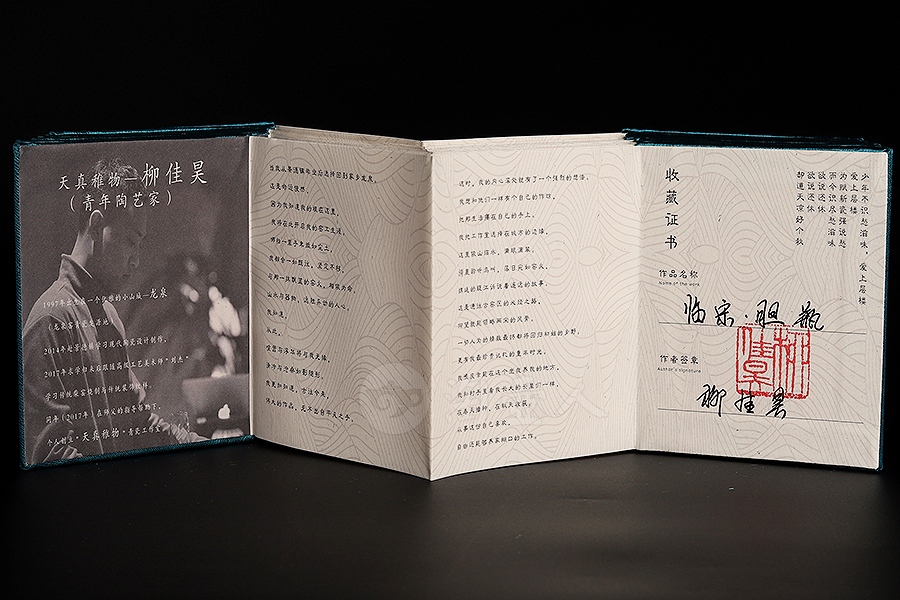 柳佳昊,男,1997年生于浙江龙泉,2014年毕业于龙泉中职校青瓷专业,同年赴景德镇学习现代陶瓷设计制作。2017年求学归来,跟随刘杰学习传统柴窑烧制技艺,同年在师傅刘杰的帮助下创办个人工作室“天真稚物”。作品古朴自然,明净简洁。以古瓷标本为师,潜心研习釉水与烧制工艺。