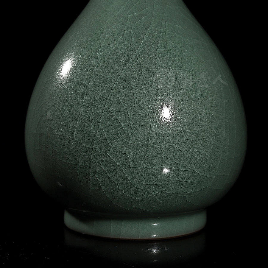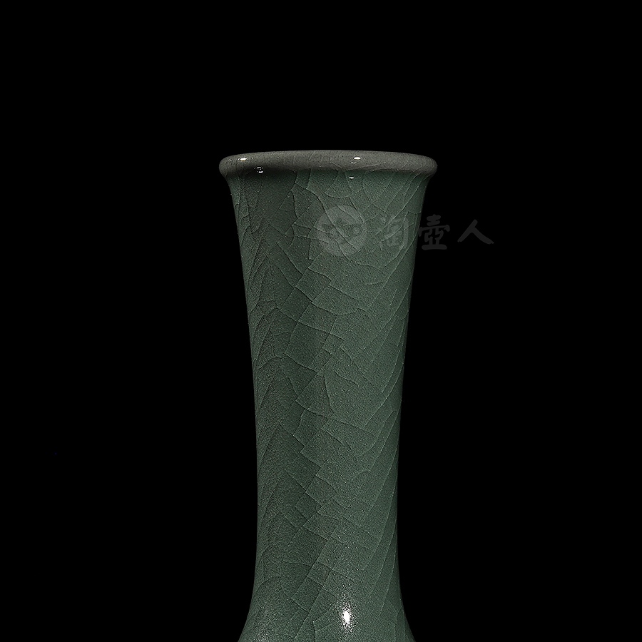 小口微侈,细长颈,削肩,肩以下渐硕,腹下部丰满,加足底,造型清隽素雅有古韵。釉面不规则开片,裂纹细碎,呈现出变幻莫测、鬼斧神工的艺术效果。
