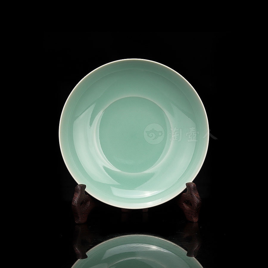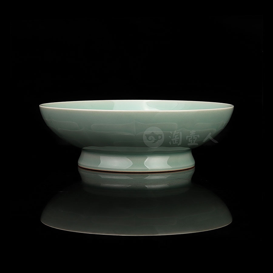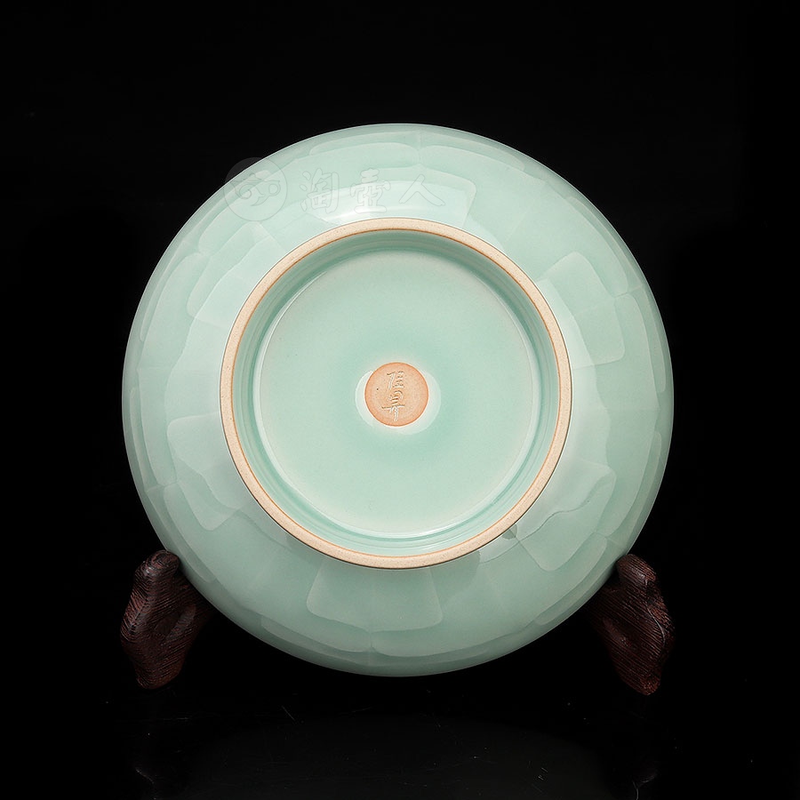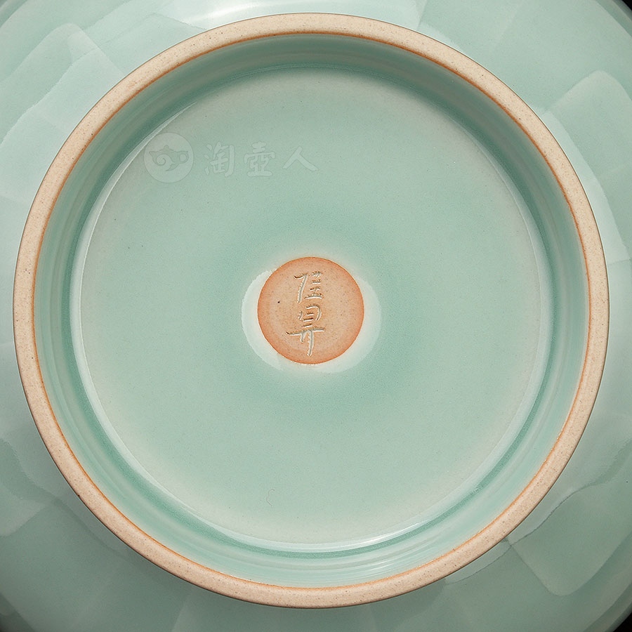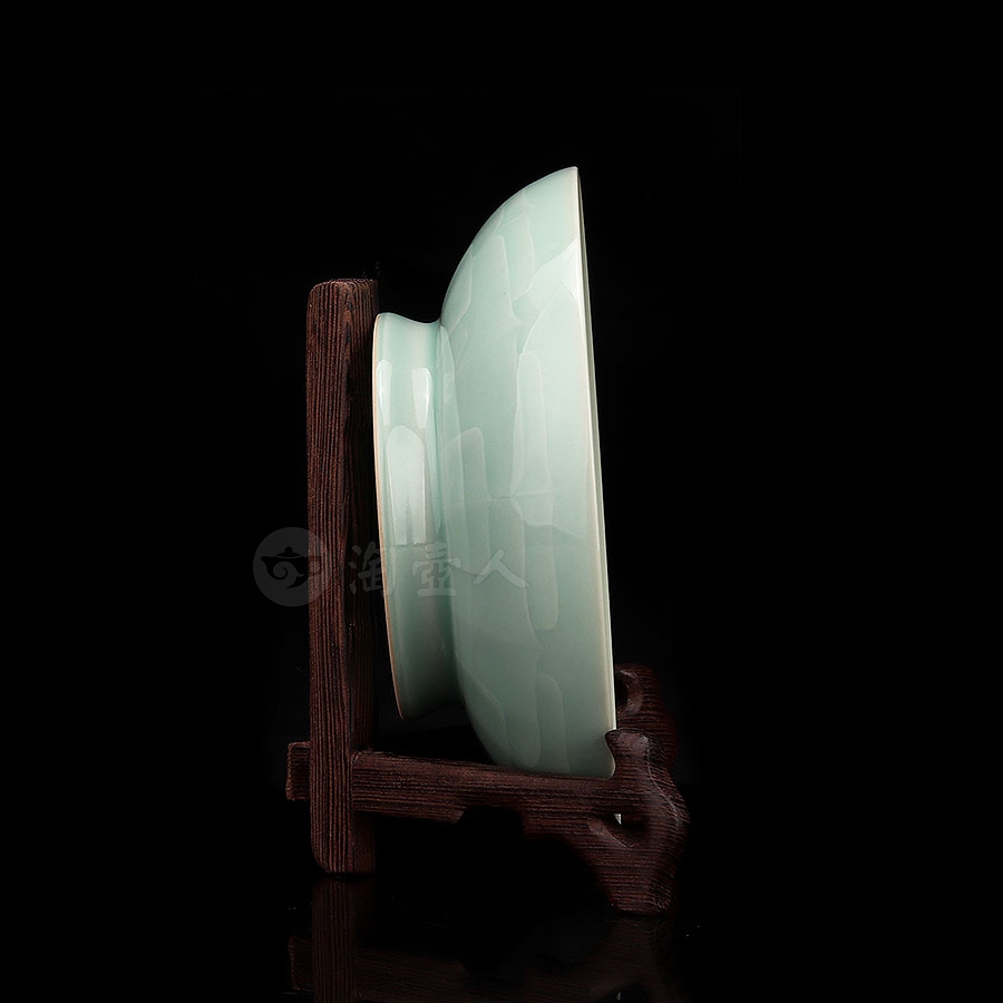 此件壶承,采用传统工艺精心打造,由匠人全手工修坯成型,胎体匀称细腻,内外通施龙泉窑经典梅子青釉,釉色青翠莹润,如青梅初熟,温润含蓄中透出灵动之气。