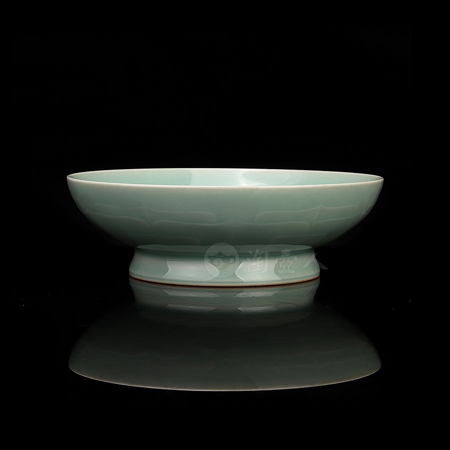 浅盘式设计,线条简洁流畅,盘面平整开阔,便于承放茶器,底部配以高圈足,挺拔稳重。外壁雕刻双层莲瓣纹装饰,既保留了宋代瓷器素雅清丽的风骨,又赋予器物几分禅意之美。