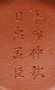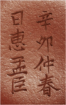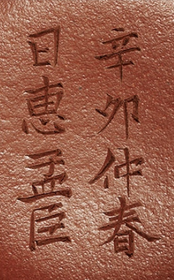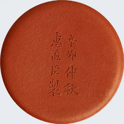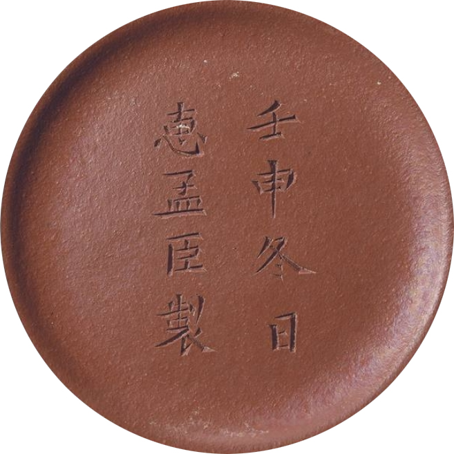 惠孟臣制壶除注重壶体浑朴精妙外,尤注重铭刻的书法。他的刻款书法秀娟,不离唐贤风格,笔法绝类唐代大书法家褚遂良。“孟臣壶”传器款识有书“文杏馆孟臣制”、“荆溪惠孟臣制”、“惠孟臣制”、“孟臣制”。有的前面标有制作年份或绝句,如“大明天启丁卯孟臣制”、“水浸一天星孟臣”、“叶硬经霜绿孟臣制”、“烟村四五家孟臣”或“云入西津一片明”、“寸心千古秀”等诗句,一般是在十几字组成的诗句或吉祥语闲章下镌刻孟臣制,字体多为楷书,也有行书体,笔势灵动,具书法韵味,用竹刀刻划,后期作品并用钤印。孟臣壶的款识以盖内有“永林”篆书小印者为精品。