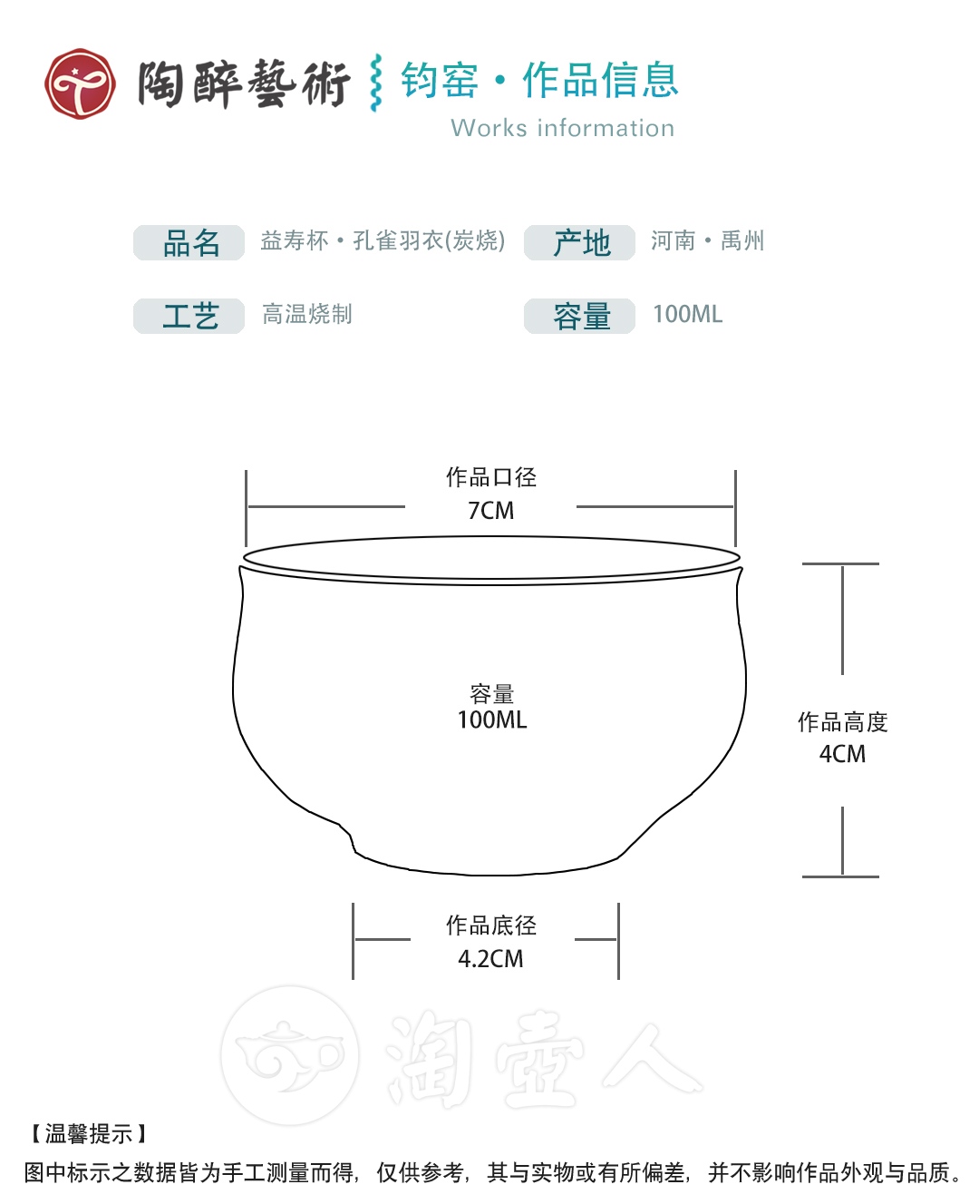 作者:周松建编号:695032容量:100CC材质:钧瓷口径:7cm底径:4.2cm总高:4cm工艺:纯手工产地:河南·禹州器型:束口碗类别:杯 作者更多作品》