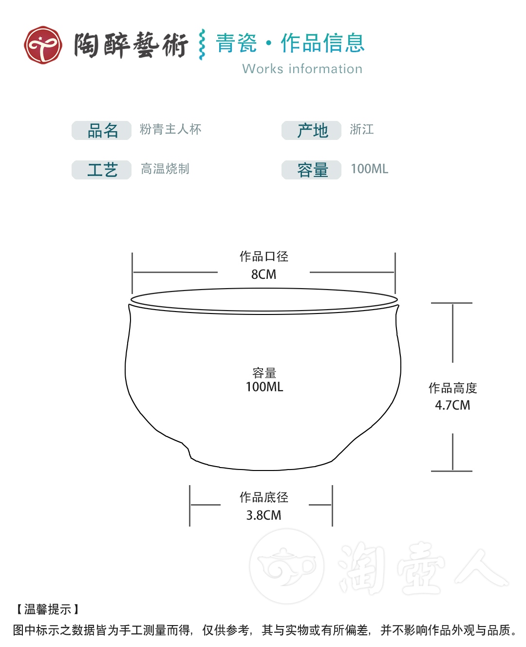 作者:徐定昌编号:705803容量:100CC材质:青瓷口径:8cm底径:3.8cm总高:4.7cm工艺:纯手工产地:浙江·龙泉器型:敛口碗釉色:粉青釉品类:品茗杯 作者更多作品》