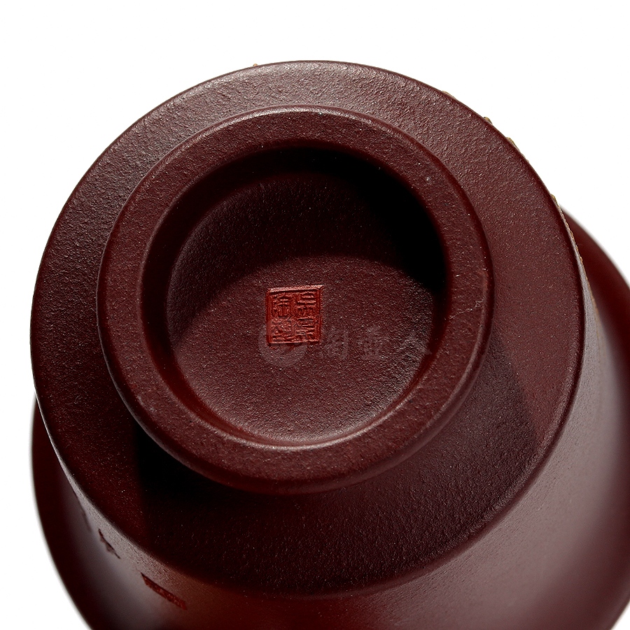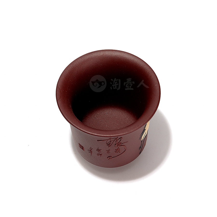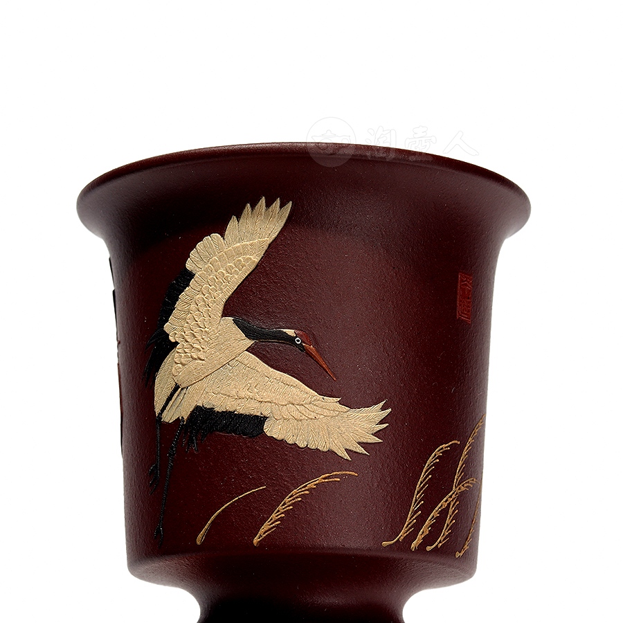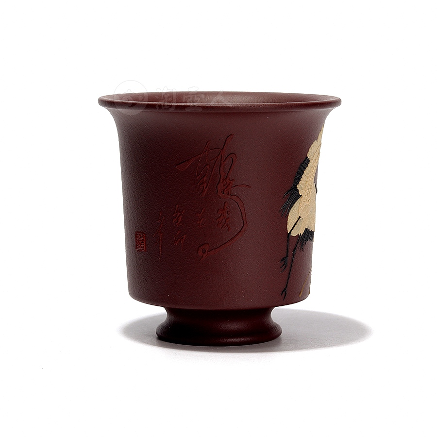 此品茗杯为作者选用原矿紫泥精制而成,泥色温润雅致,壶身修长挺拔,口沿微外撇,使茶汤入口时更为润滑。通体泥绘装饰,为其点睛之笔,作者妙用自己调配的原矿紫砂泥,于杯正面绘一仙鹤展翅,旁配以“鹤”字,气韵生动,庄重儒雅,画面精美,工艺精湛,艺术性与实用性兼具,鹤亦表延年益寿之意,自用馈赠两相宜。