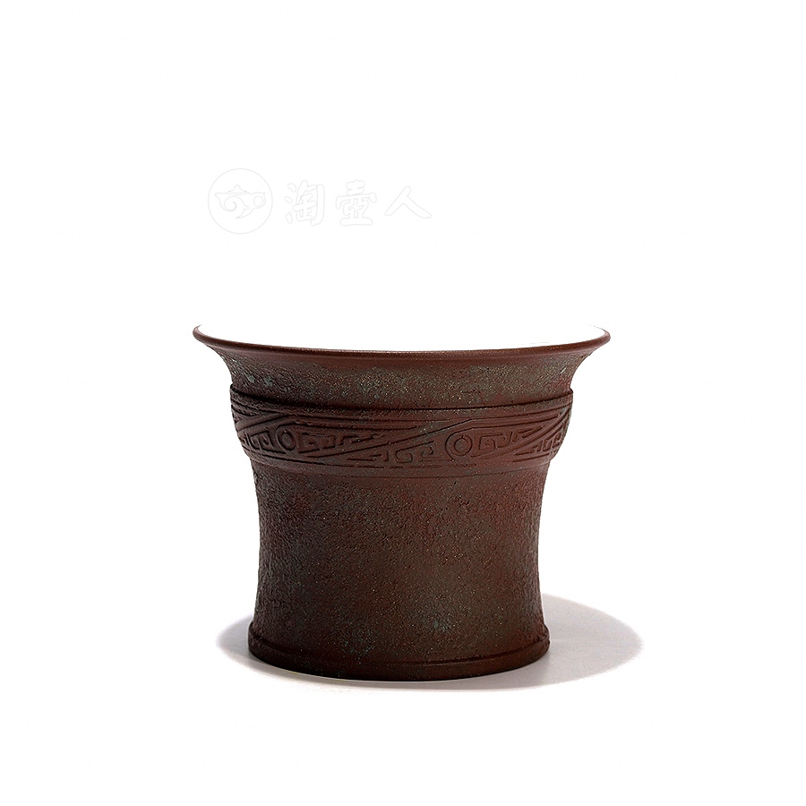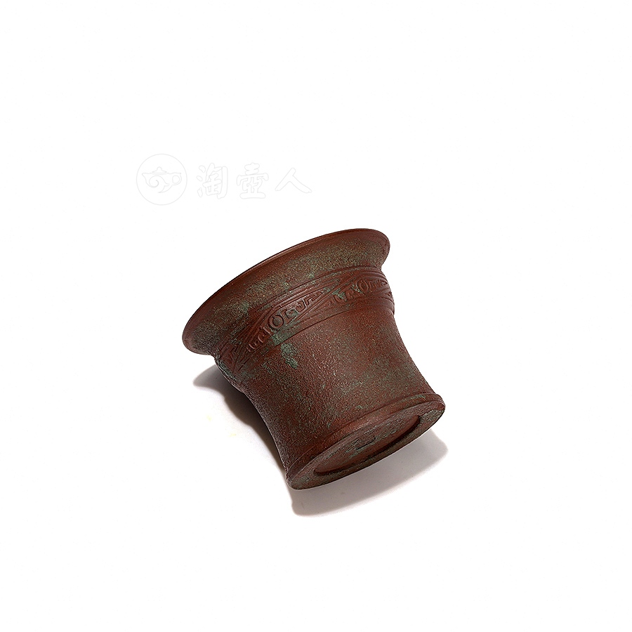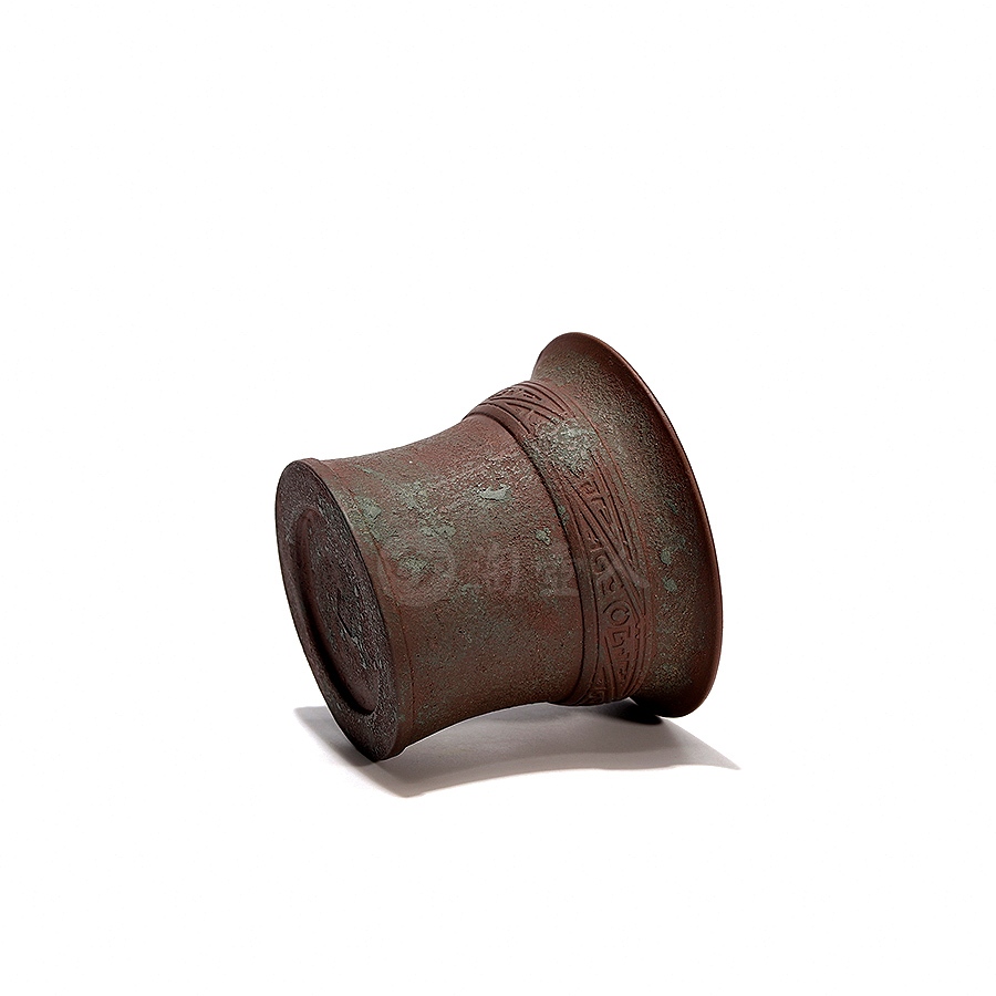 此件马蹄杯为原矿紫泥所制,倒置形似马蹄,敞口,斜削腹,内凹小平底。内壁施白釉,外壁采用粉浆工艺,营造出青铜古器质感,锈斑纹理修饰得细腻逼真,近口沿处装饰一圈斜角云纹,古朴而雅致。