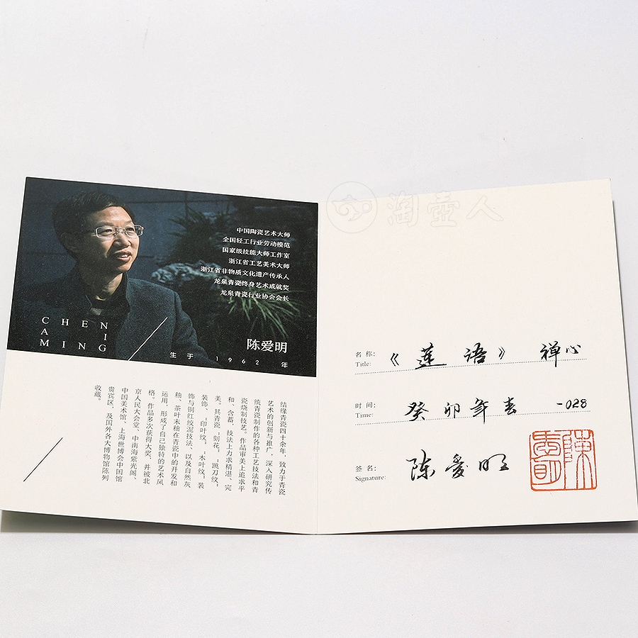 陈爱明,生于1962年,中国陶瓷艺术大师、全国轻工行业劳动模范、浙江省工艺美术大师、浙江省非物质文化遗产传承人、龙泉青瓷终身艺术成就奖。结缘青瓷四十年,致力于青瓷艺术的创新与推广,深入研究传统青瓷制作的各种工艺技法和青瓷烧制技艺。作品审美上追求平和、含蓄,技法上力求精湛。其青瓷、“刻花”“跳刀纹”装饰、“印叶纹”“木业纹”装饰与铜红绞泥技法、以及自然灰釉、茶叶末釉在青瓷中的开发和运用,形成了自己独特的艺术风格。作品多奖获得大奖、并被北京人民大会堂、中南海紫光阁、中国美术馆、上海世博会中国馆贵宾区收藏。