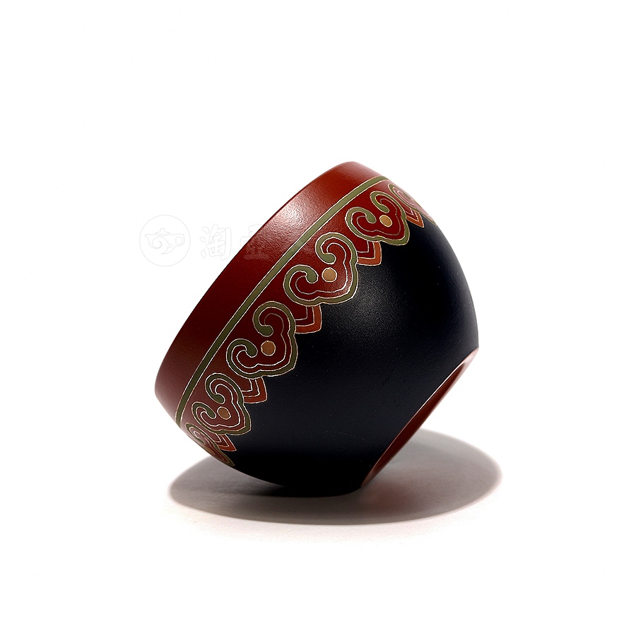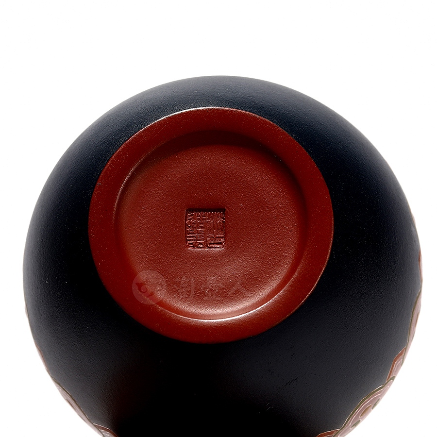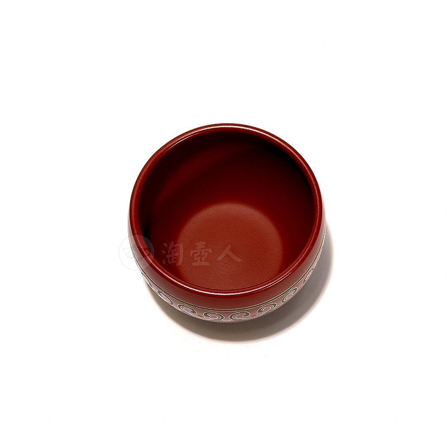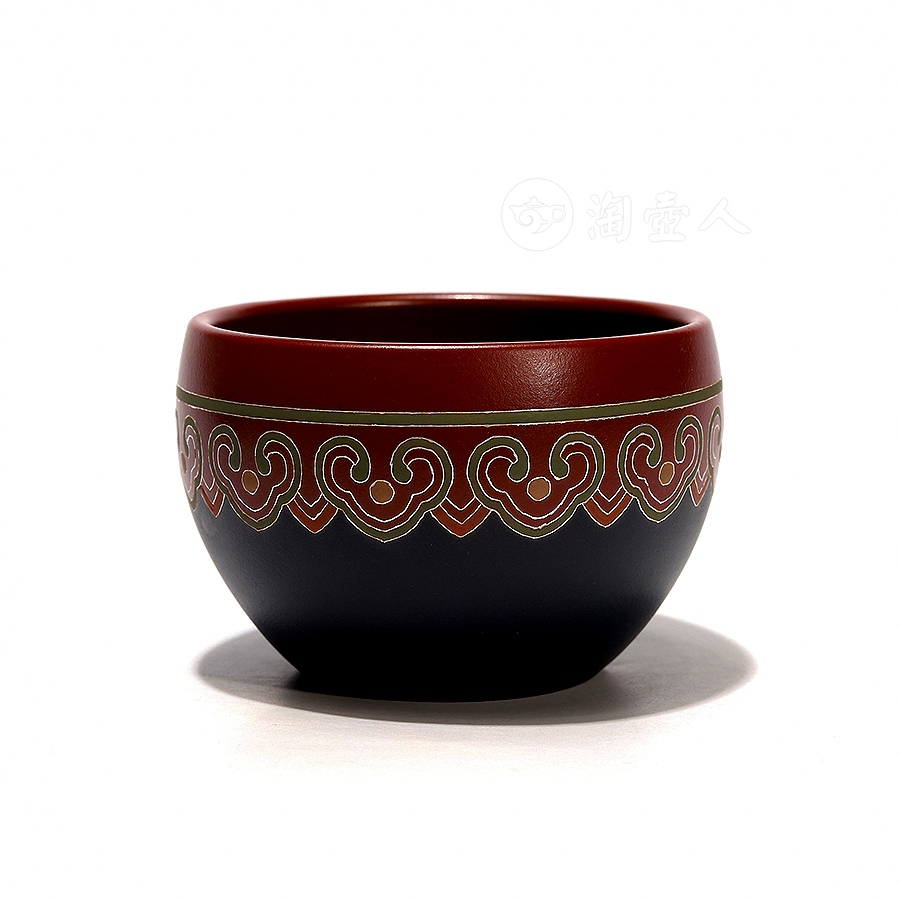 此件福缸杯,敛口,鼓腹,至杯底渐内收,整体造型似一口水缸。原矿大红袍所制,外壁粉异色泥浆,勾勒出古朴华美的纹饰,并采用银丝镶嵌工艺包边,工艺极为复杂,但呈现出的效果极佳。