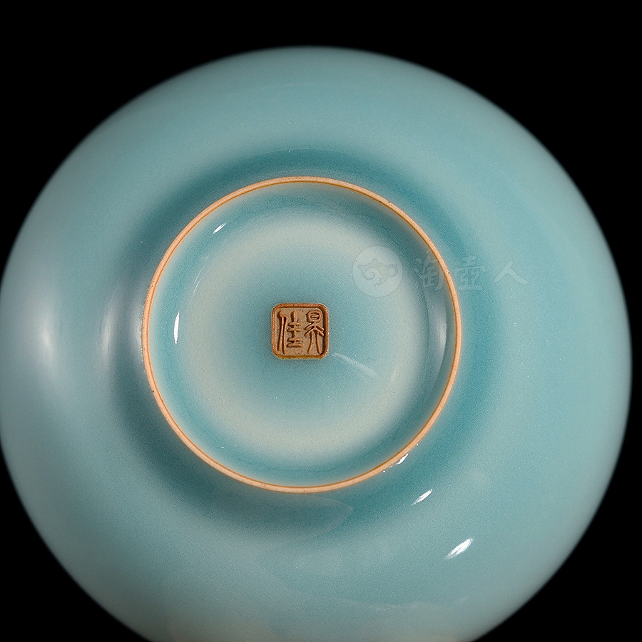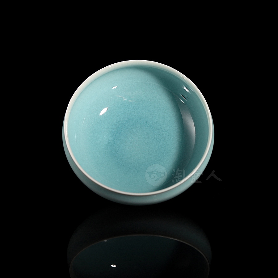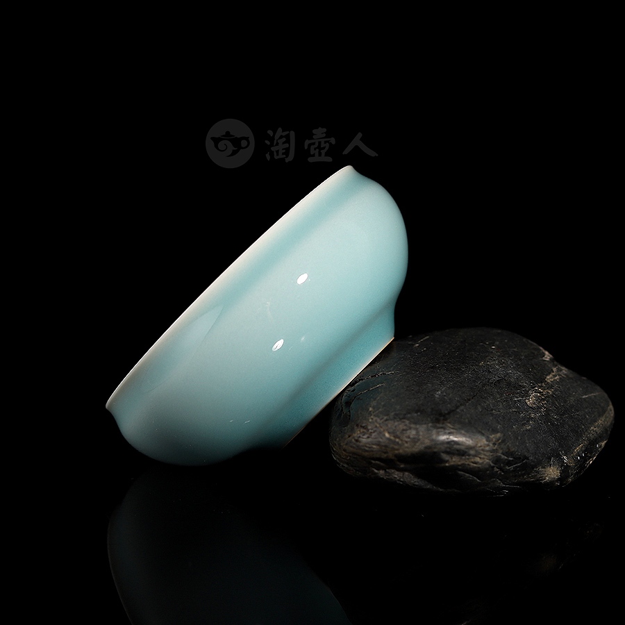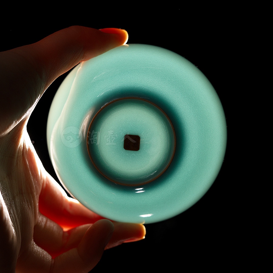 杯型为束口碗式,圈足、扁腹,杯身线条流畅。杯身施以粉青釉,釉色发色高雅、内敛、含蓄,青中带蓝,细腻度非常高级,粉亮度更高、更清透,工、型、釉可媲美顶尖青瓷。