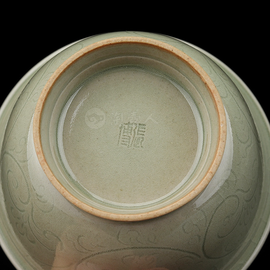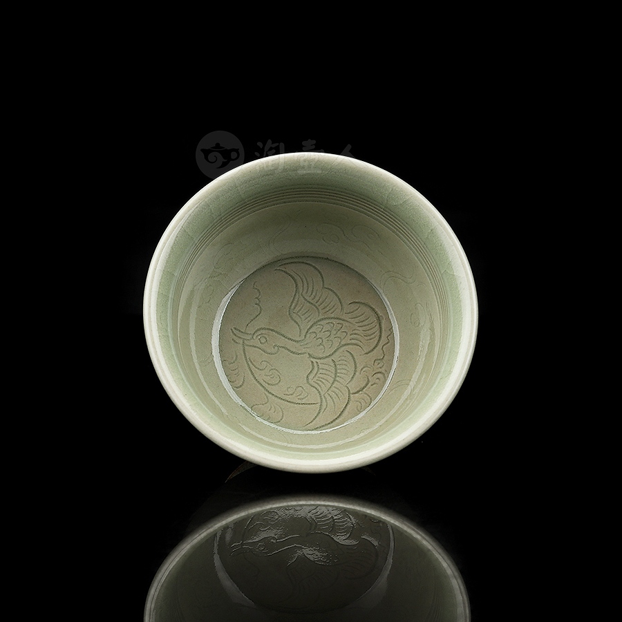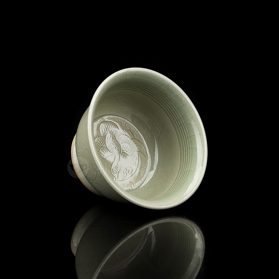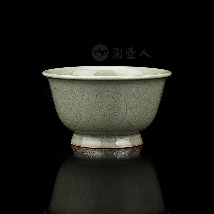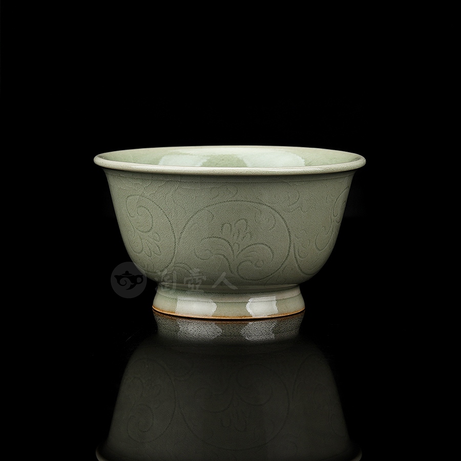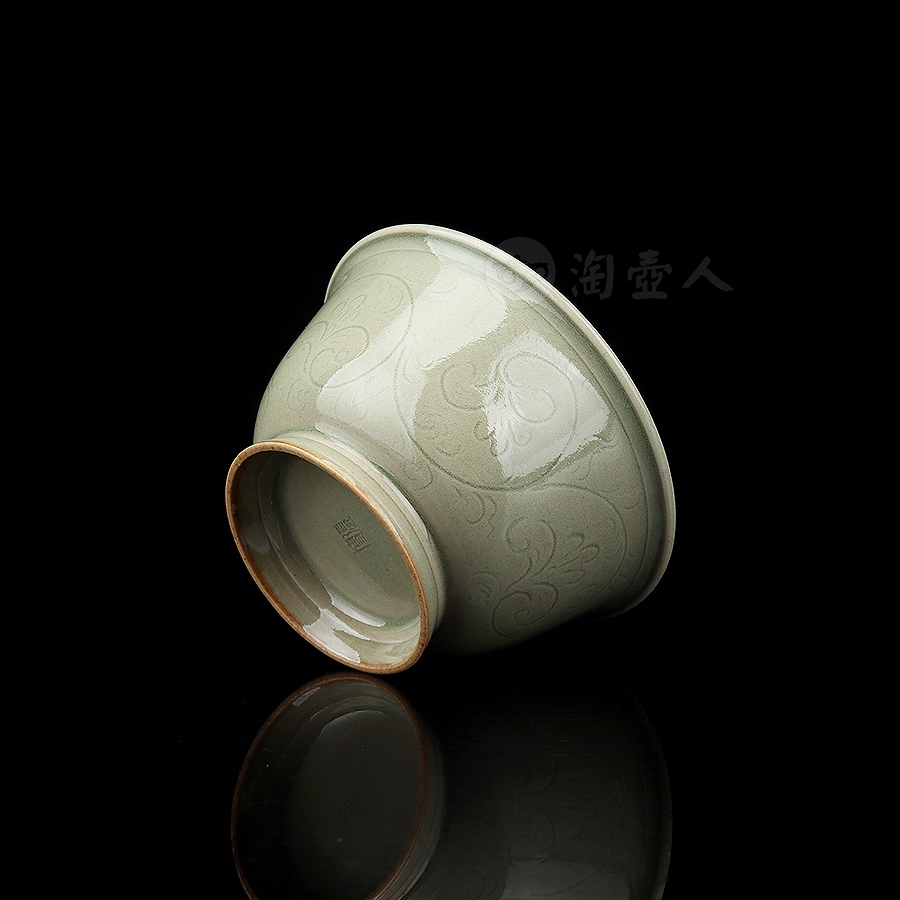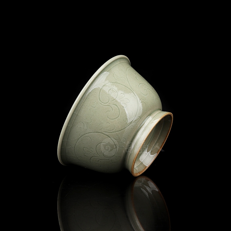 此杯薄胎薄釉,釉色古朴耐看,弧腹,口沿外翻,底足微撇,全手雕花装饰,外壁通身饰缠枝纹,内壁近口沿处饰弦纹,底为“鸿鹄之志”纹饰,寓奋斗精神和追求精神。