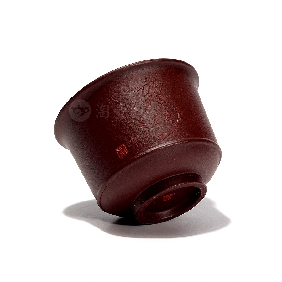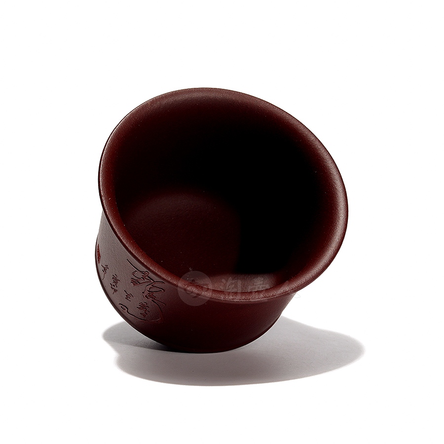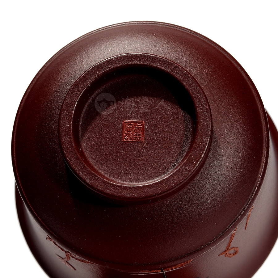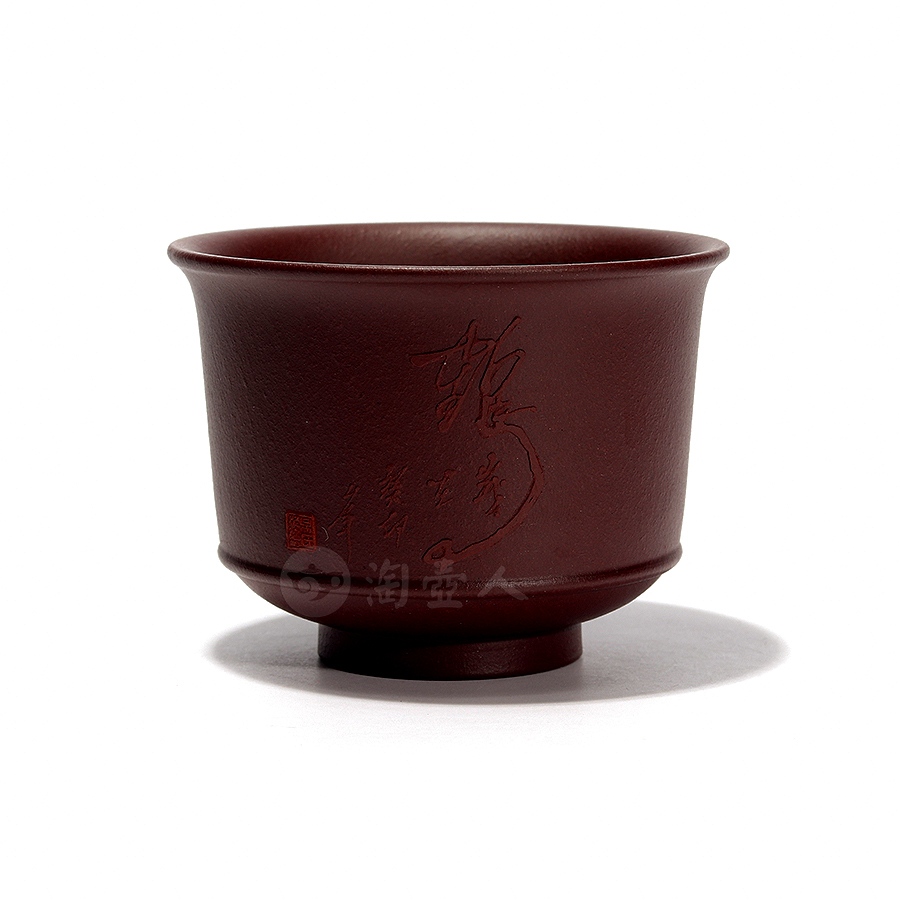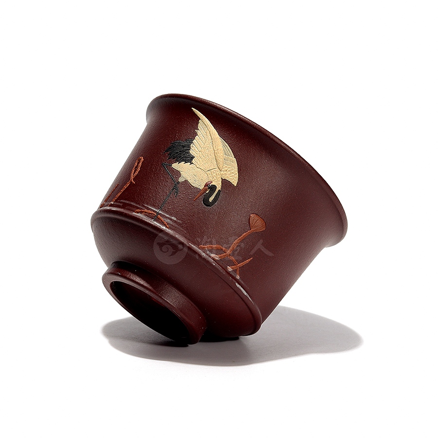 此件主人杯采用原矿紫泥制作而成,泥色紫润。杯口外撇,直壁利落,至底以弧线渐收束,下接圈足。外壁一面泥绘浅滩残荷,一只仙鹤单脚站立,引吭回首,画面纤毫无爽,形神兼备,色彩和谐;另一面一个潇洒的“鹤”字强化主题。