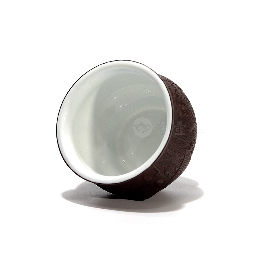 此件主人杯选用原矿紫泥制作而成,圆口撇沿,垂腹,高圈足,器型肃穆稳重,古意卓然,有大气磅礴之感。器内施白釉,外壁仿青铜器质感,乃是采紫泥与绿泥双色泥料,以高难度粉浆工艺纯手工修饰而成,锈蚀之感犹如天成,愈泡养愈显。