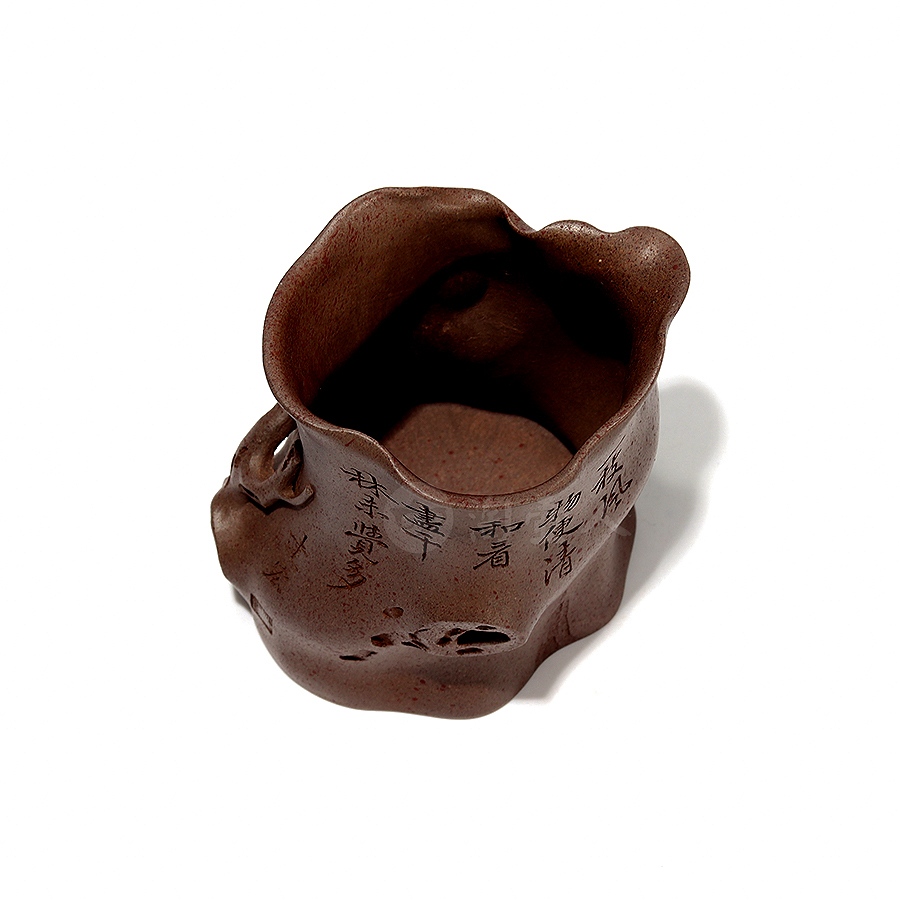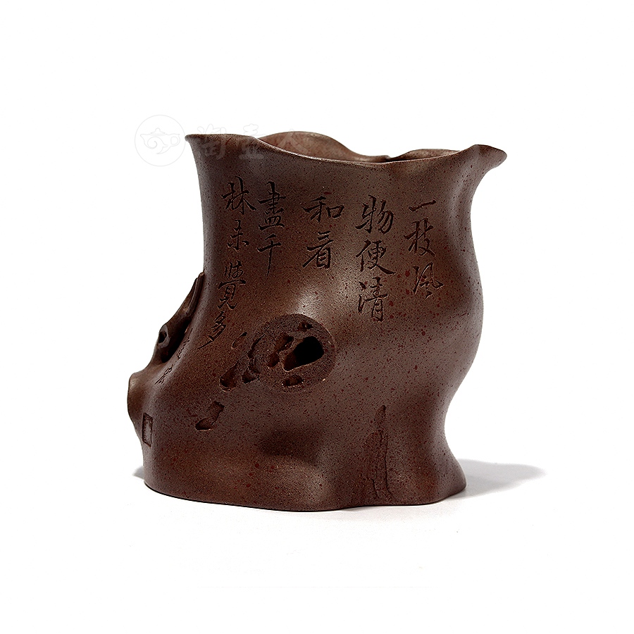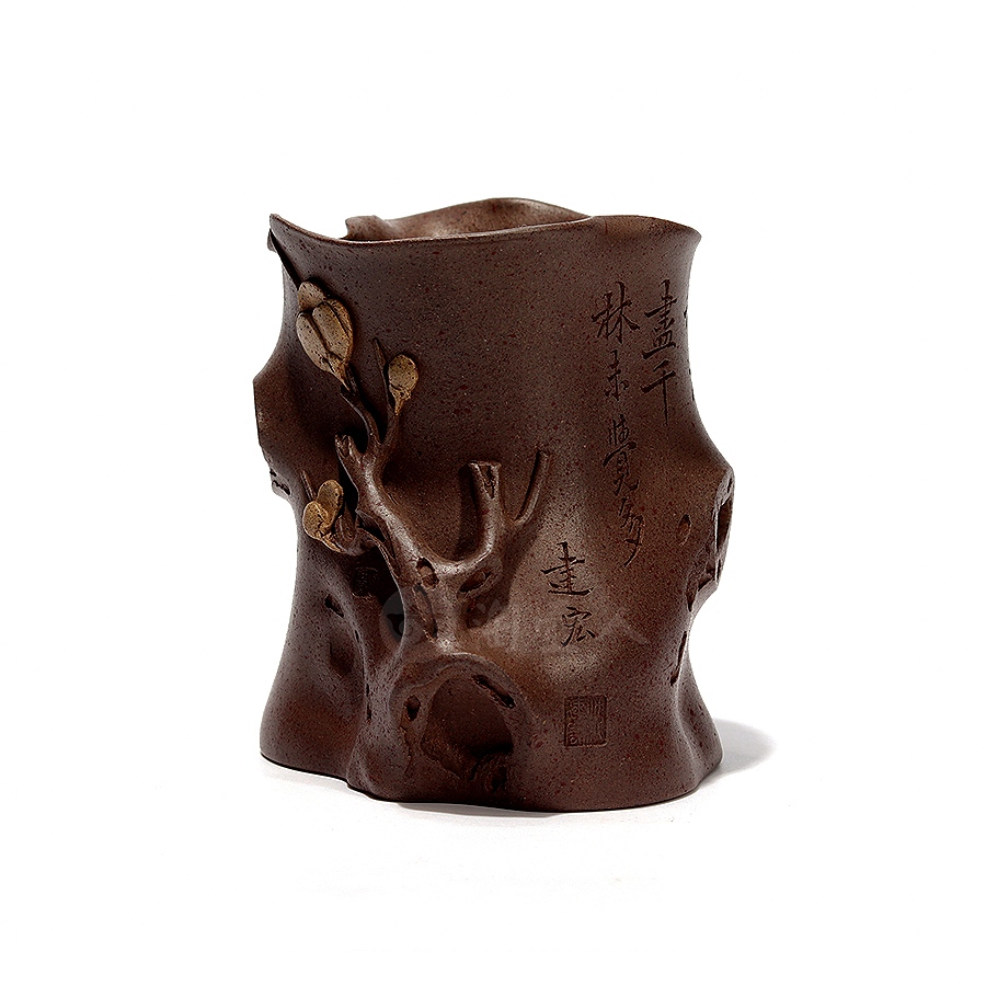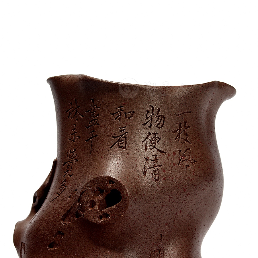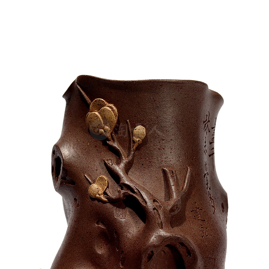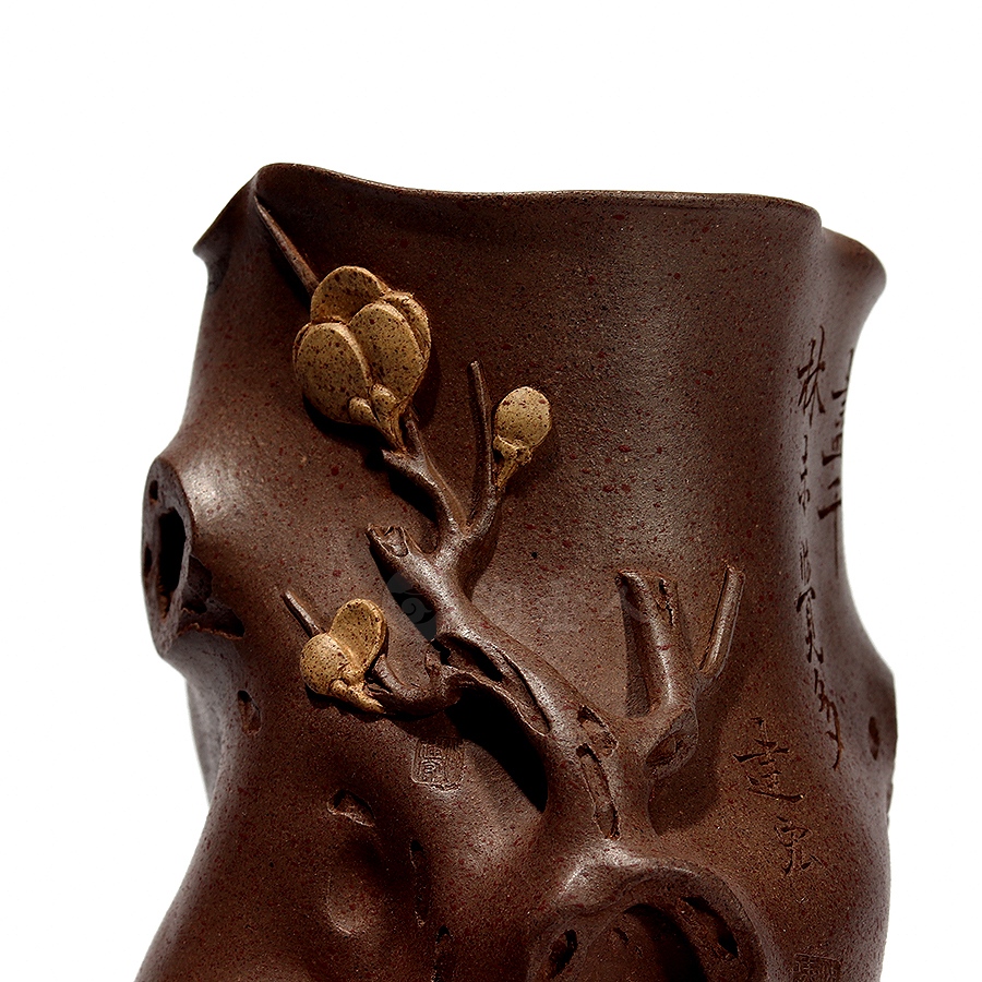 以梅花为题材,杯体为一截树桩,瘿节、孔洞遍布,杯口自然随形,小段梅枝自杯底延伸而出,依附于杯身,段泥做出朵朵含苞待放的梅花点缀枝头,花枝旁留白处陶刻苏轼咏梅诗句“一枝风物便清和,看尽千林未觉多”,呼应有致。此杯小小一件便将梅花形态表现得淋漓尽致,再配以契合肌理的泥色和洒红修饰,给人以鲜活的审美感受,值得精心收藏。