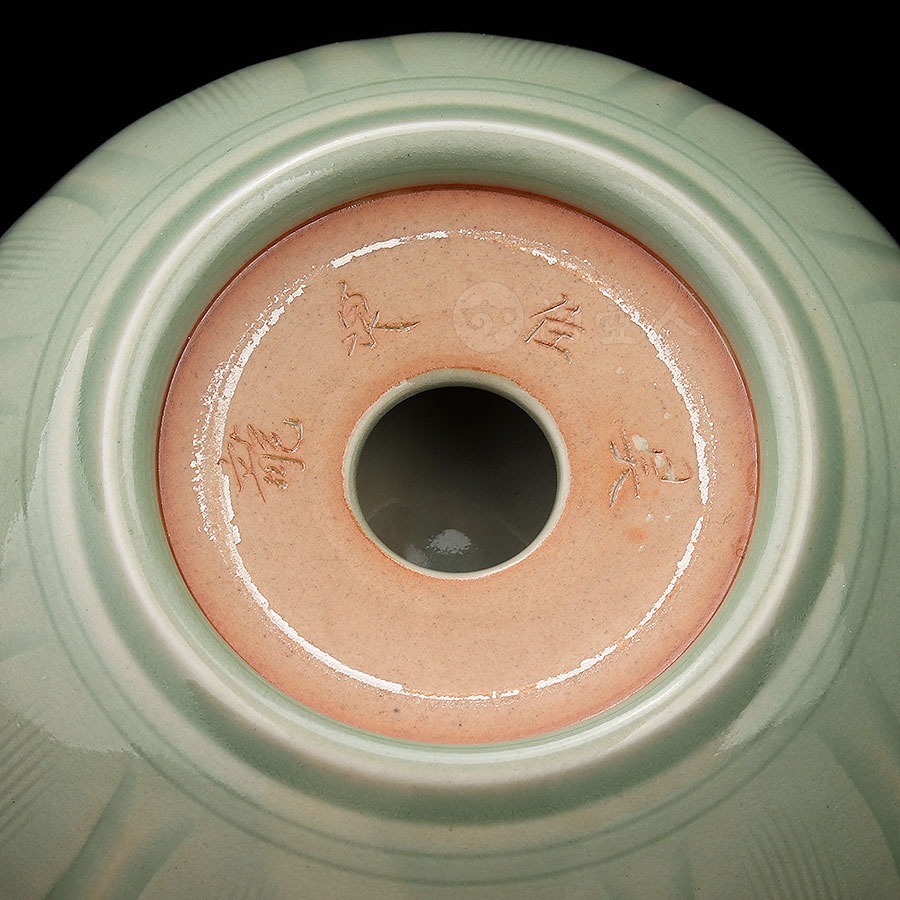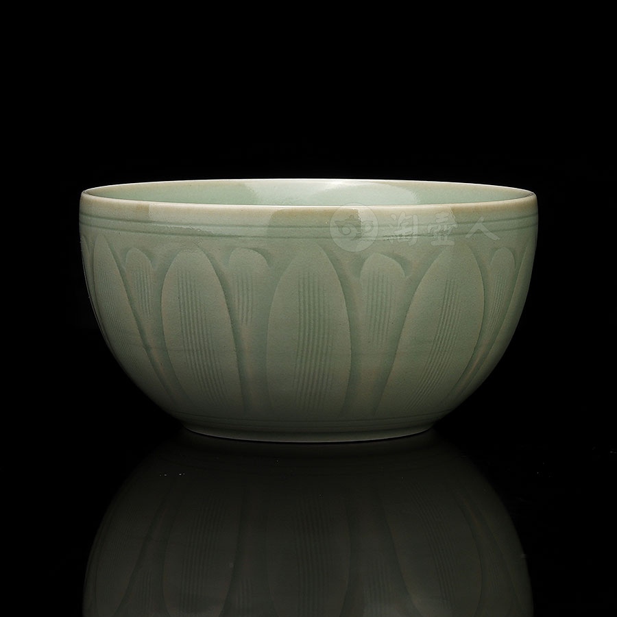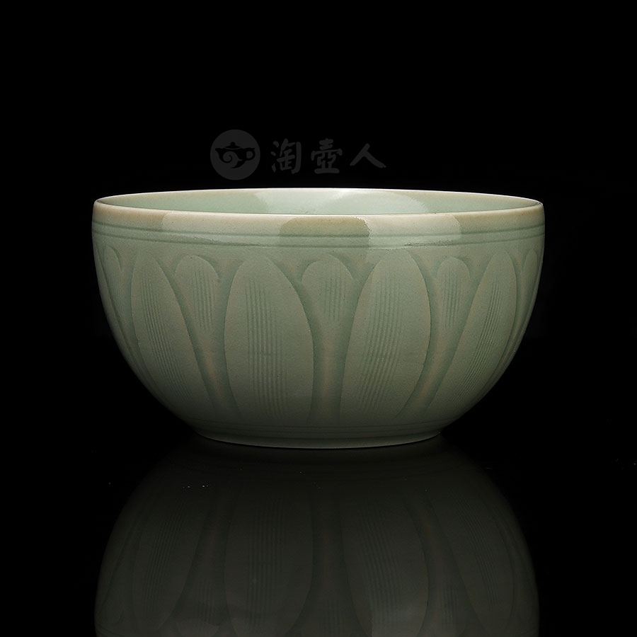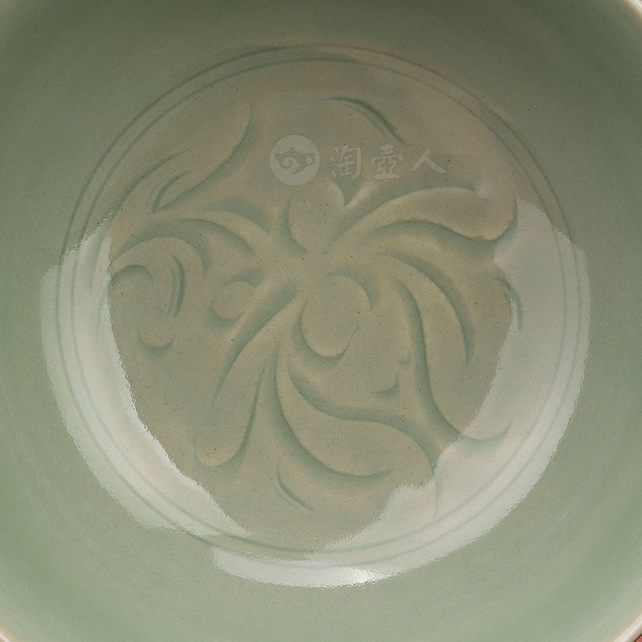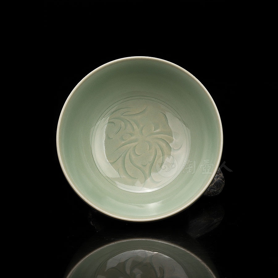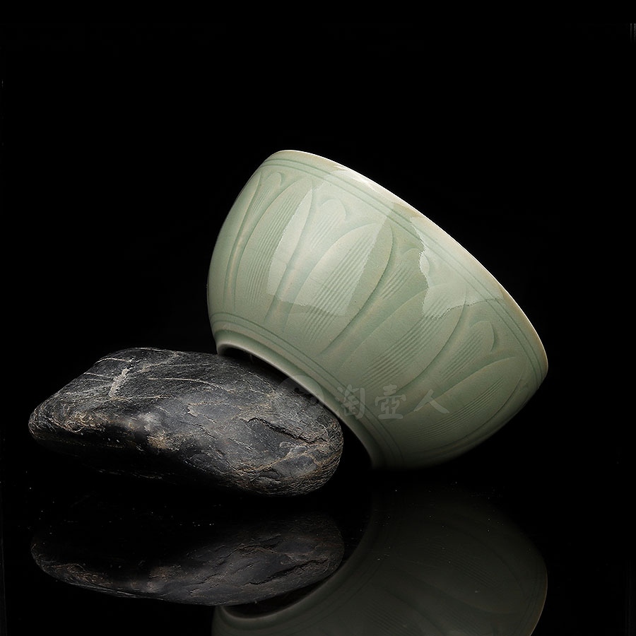 杯体为经典敛口弧腹造型,配以稳重的矮圈足,整体简洁而雅致,以纯手工雕刻技法,在内壁精心雕琢一朵盛开的莲花,外壁则饰以繁复的重瓣莲纹,内外纹饰相互呼应,形成和谐统一的艺术效果。雕刻完成后,通体施以龙泉窑特色梅子青釉,釉色温润如玉,在高温烧制后呈现出深浅有致的层次变化。