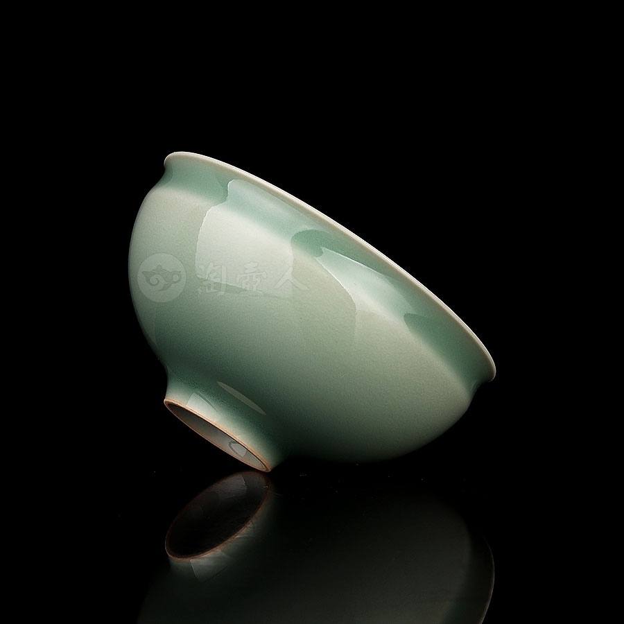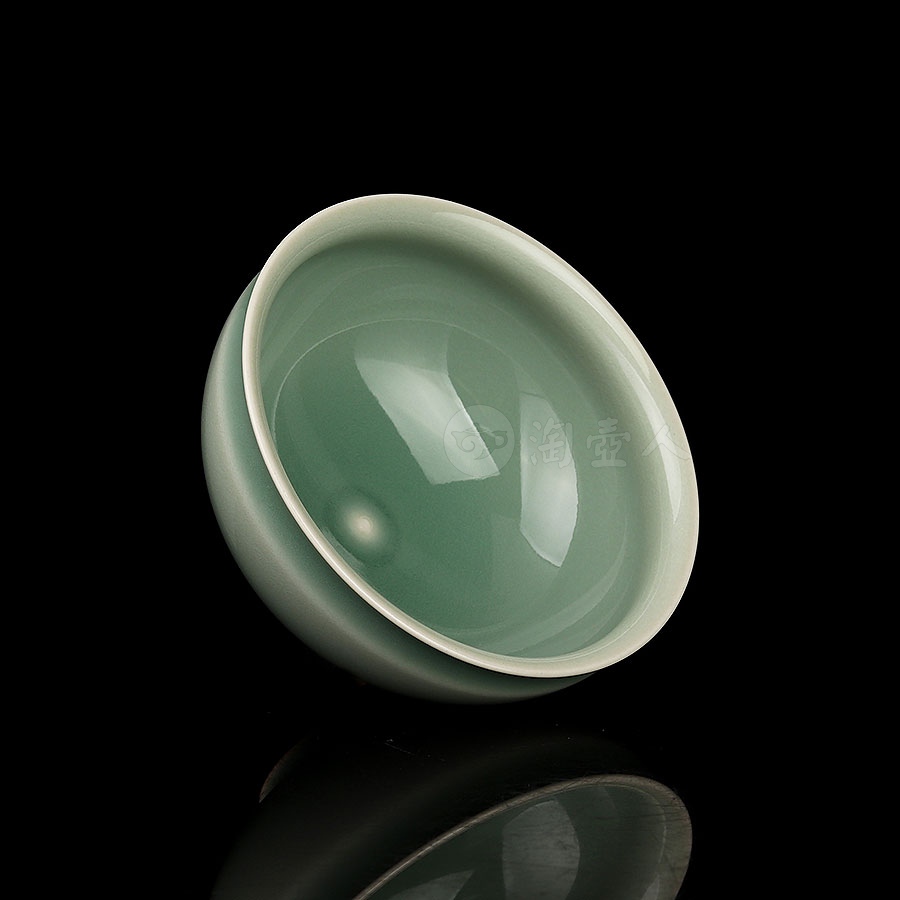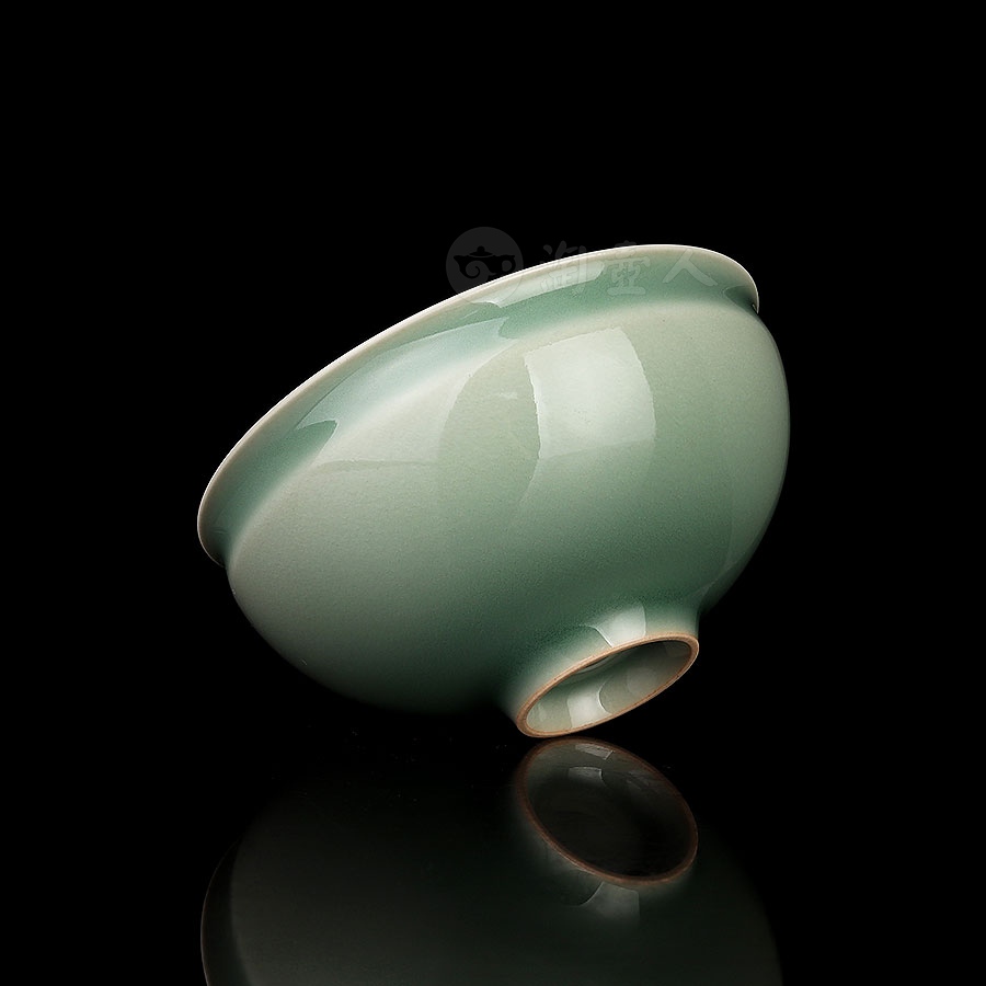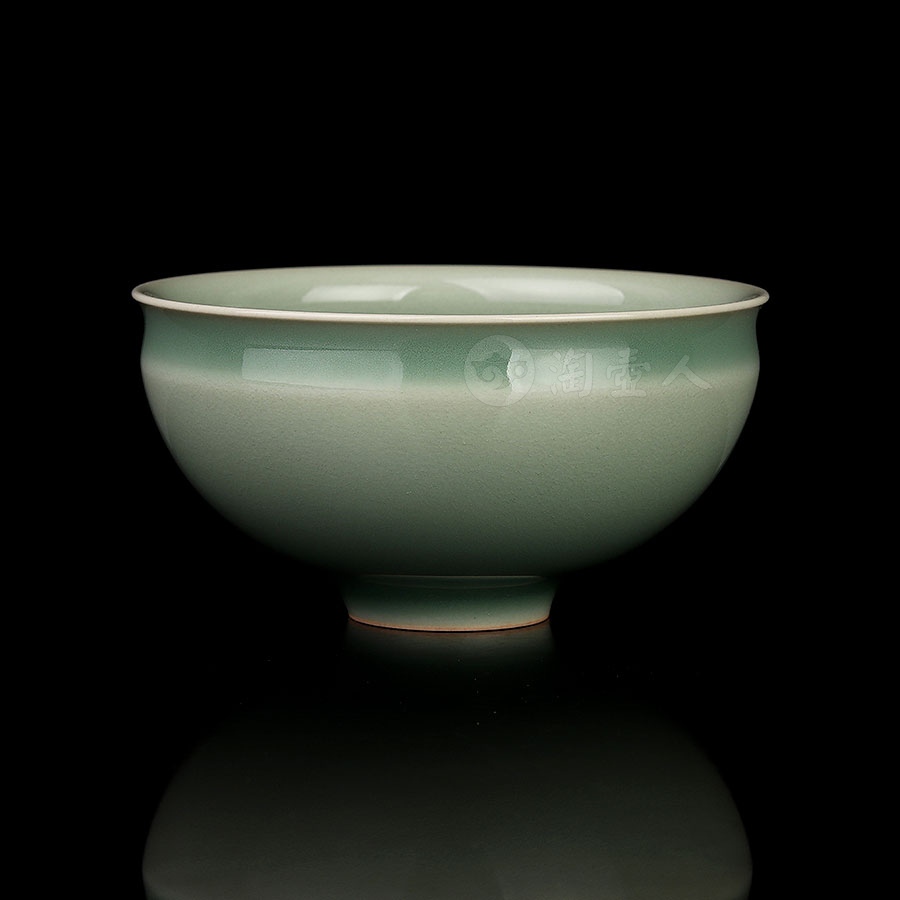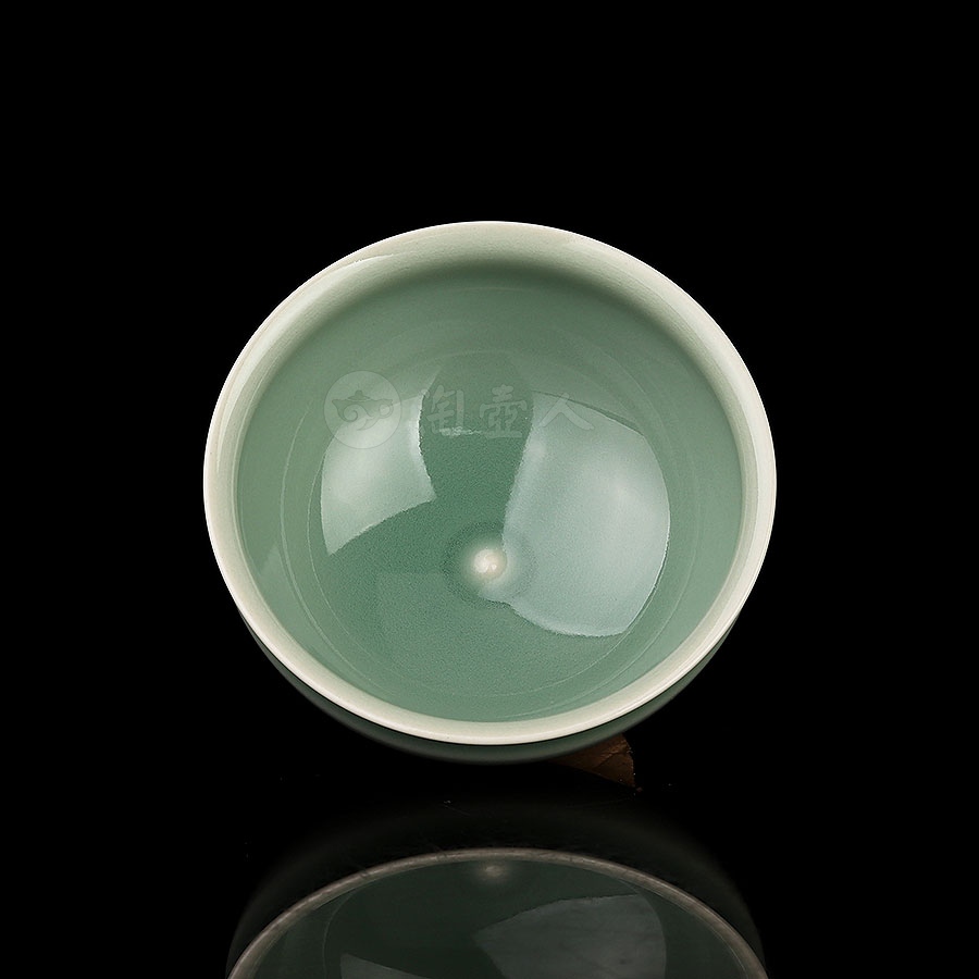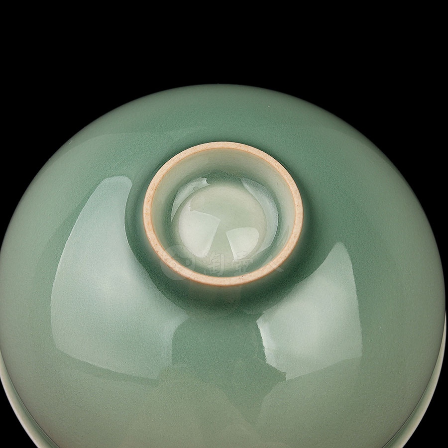 此件束口杯,形制精巧,以朱砂为胎,外施青釉,釉色莹润如玉。束口设计,口沿外撇舒展,与虎口弧度完美契合,执握时贴合掌心,圆腹饱满丰盈,向下渐次内敛,形成优雅的流线型轮廓,圈足直挺,足底露胎处可见细腻的朱砂胎骨。