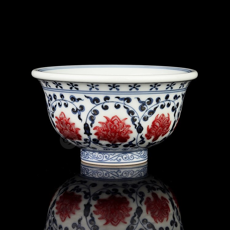 釉里红压手杯,起源于永乐大帝,也叫“永乐青花缠枝莲压手杯”、“永乐压手杯”,器形威严,霸气有份量感,也是为数不多以皇帝命名的杯型,釉里红,是铜为颜料,跟青花温度相差几十度,温度低了会烧出绿色,温度高了会发灰、会烧没,所以釉里红,烧窑难度极大,釉里红的可贵就在于它的流动性,不稳定性,故成品率在瓷器里是最低了。
