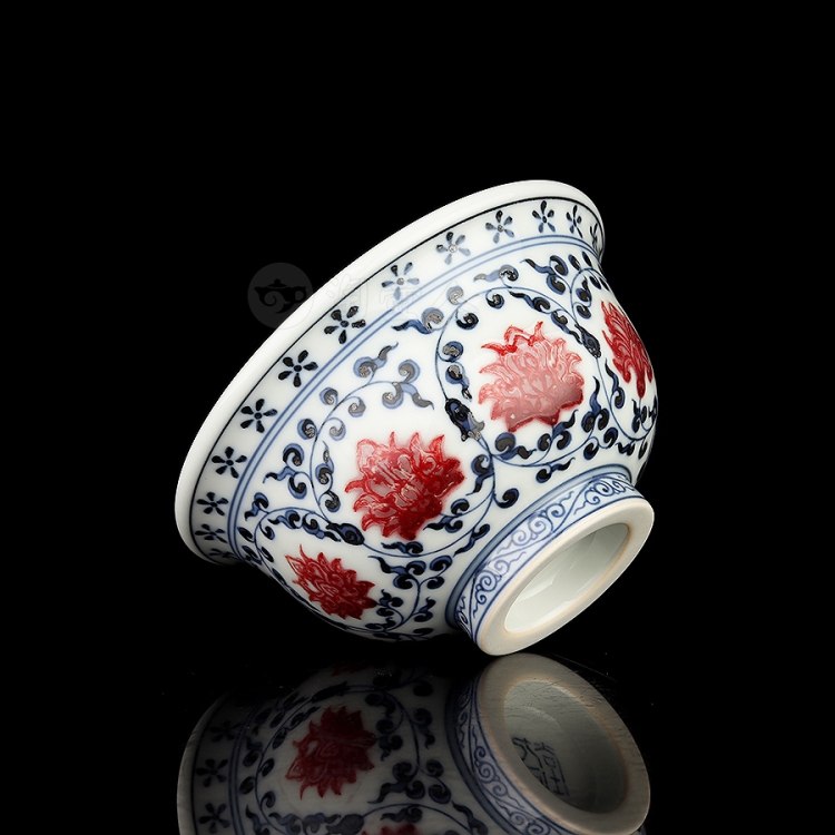 青花之雅,恰能弥补釉里红呈色层次变化的细微不足,釉里红之艳,又为青花瓷的素净增添了鲜活色彩,二者相融相生,青如远山含黛,红似丹枫映霞,清雅与妖娆并存,深沉与热闹共生。最终在这方寸杯身之上,达成幽靓雅致与浑厚壮丽的完美平衡,将中式美学的和谐之境展现得淋漓尽致。