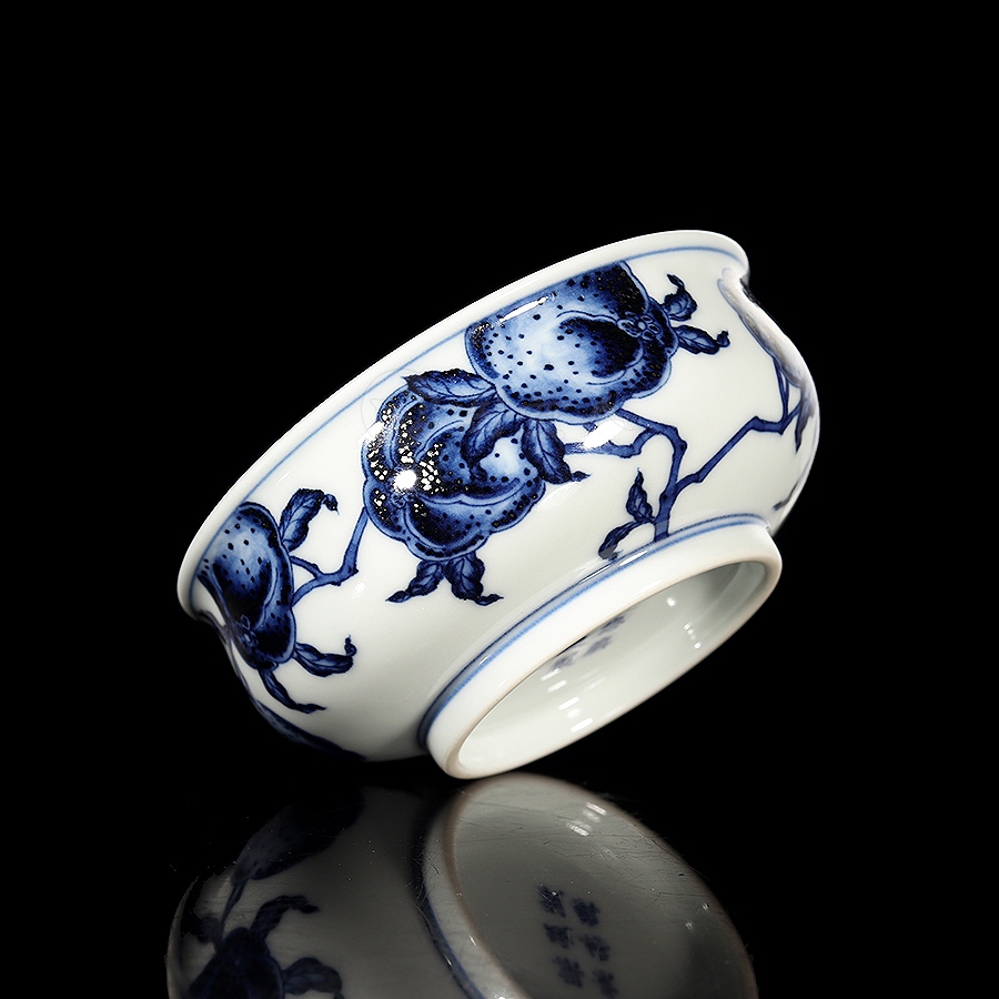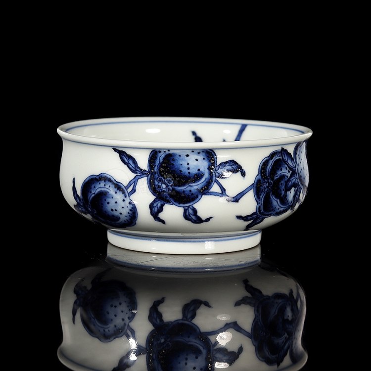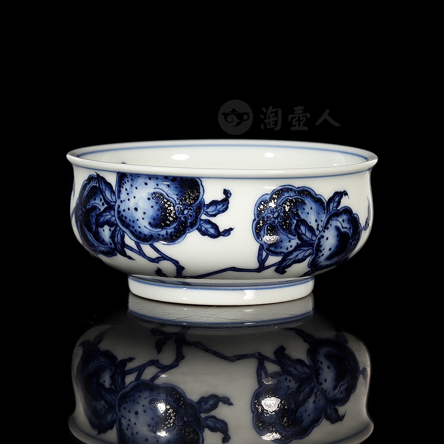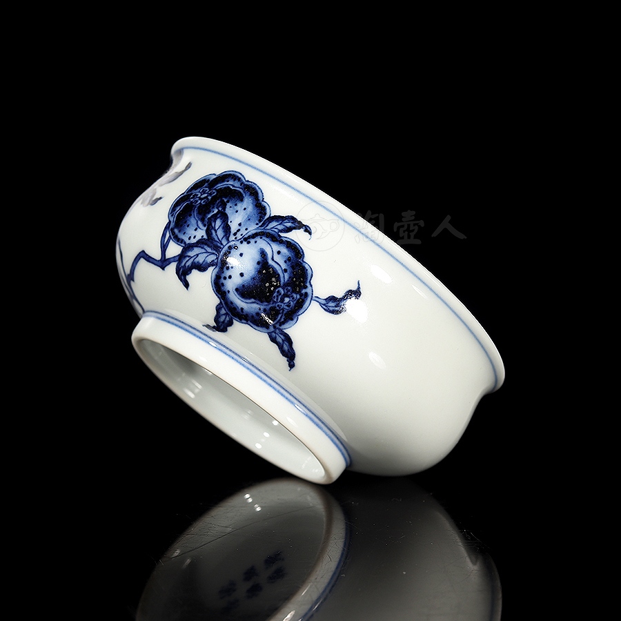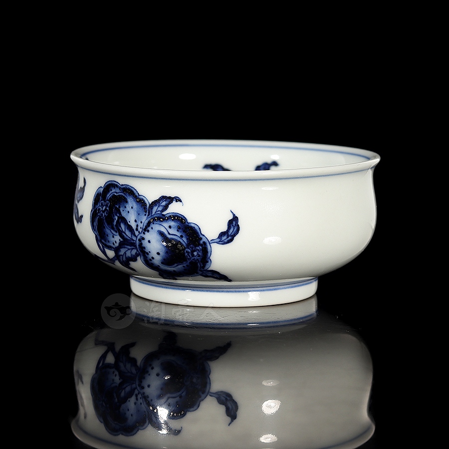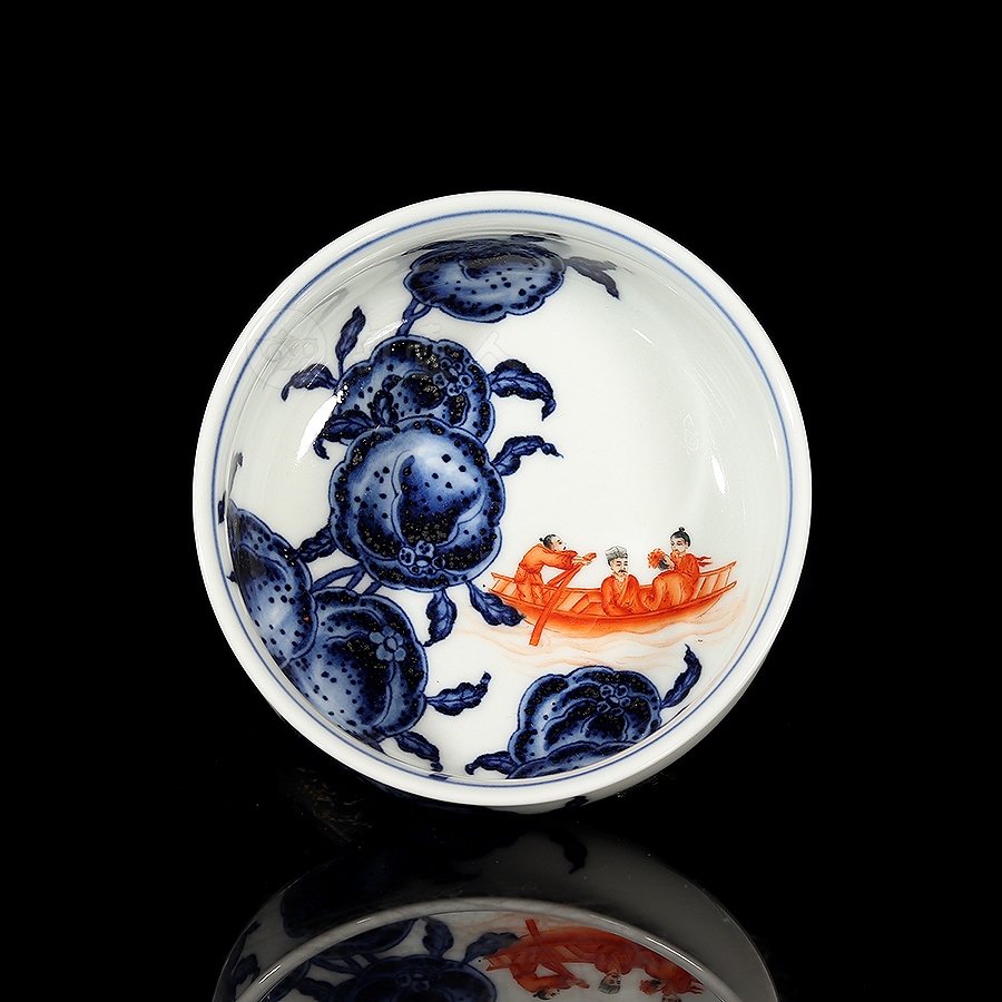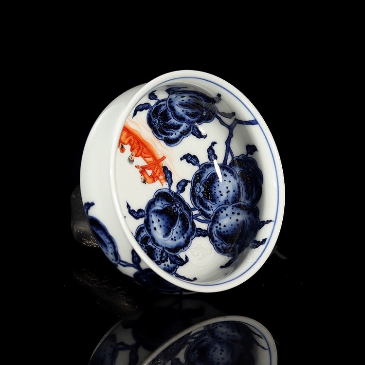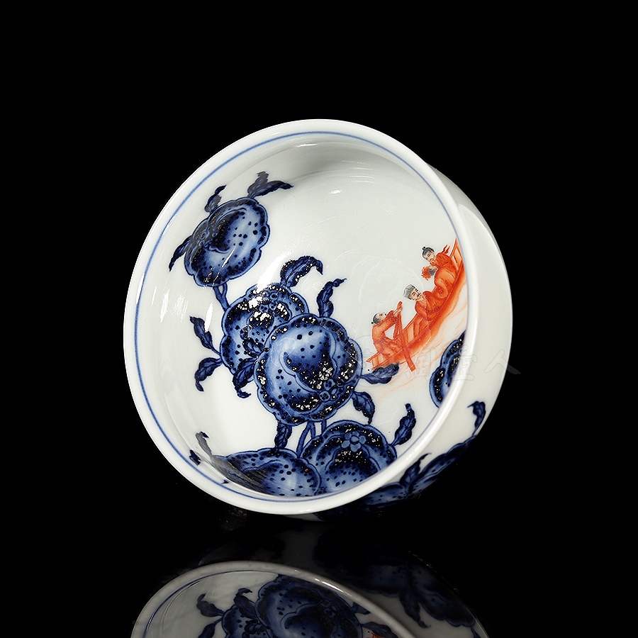 此件青花杯,矮身、束口、圆唇、深弧腹,配圈足,器型端庄小巧,尽显古典雅韵,杯身图案为纯手绘装饰,内外壁以青花绘制桃果,青花发色浓淡相宜,笔触细腻灵动,内底则以矾红勾勒文人雅集图景,图案虽小,细节却精致入微。