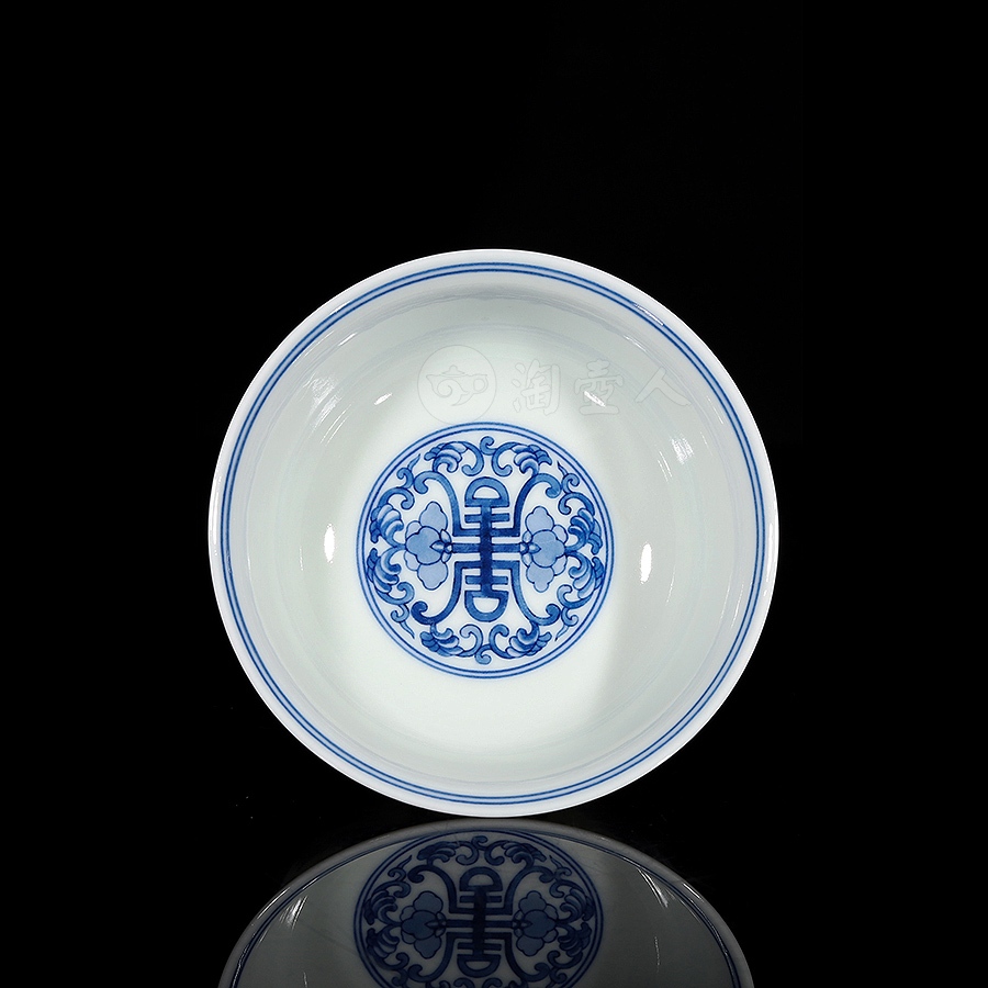 此杯矮身,弧腹,撇口,圈足,器型简洁,通身素白瓷胎温润如玉,泛着柔和光泽,为青花图案提供了绝佳的画布。杯身以精湛的青花分水技法绘人物雅集图,松林掩映间,雅士们听琴品茗,一派惬意景象,杯口、圈足各饰双弦纹,杯内底装饰寿字团花纹,既寄托了吉祥长寿的美好寓意,又为器物增添了含蓄的细节之美。