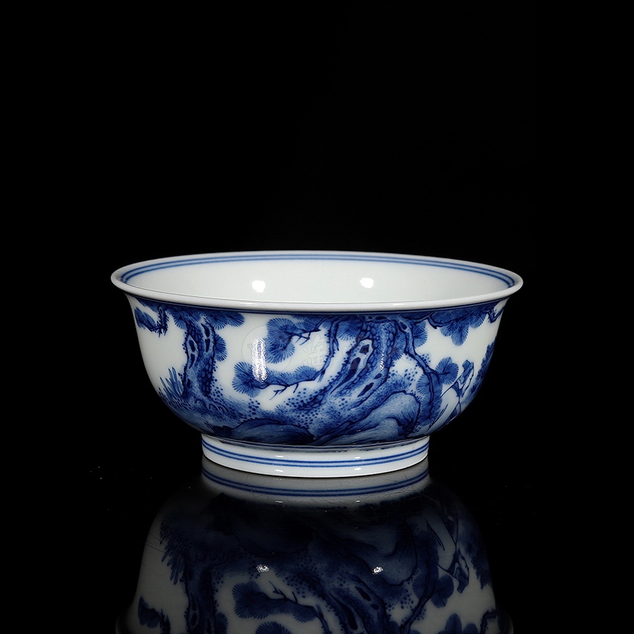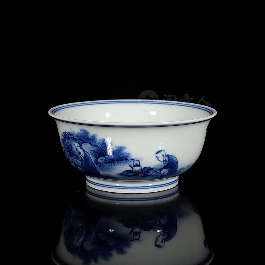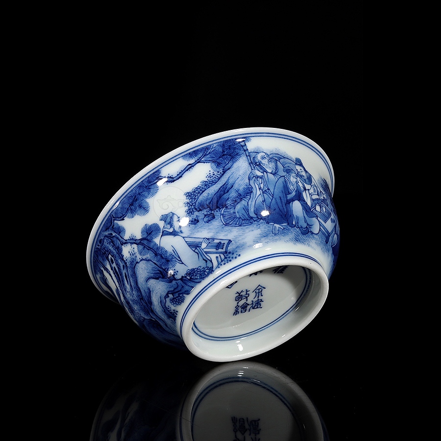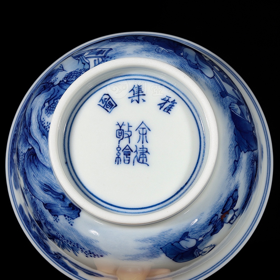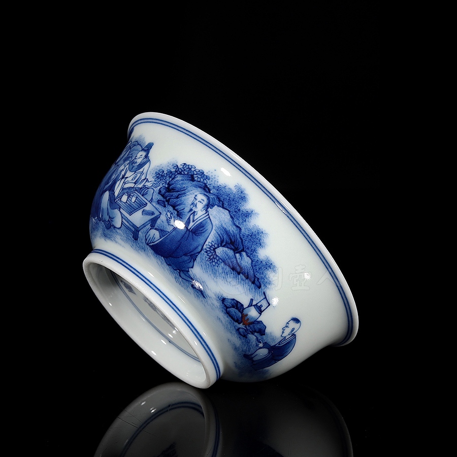 此杯将简洁器型与繁复纹饰巧妙融合,青花分水的浓淡变化赋予画面层次感与立体感,人物雅集的题材更是暗合文人雅士追求闲逸生活的心境,观之悦目,用之舒心。