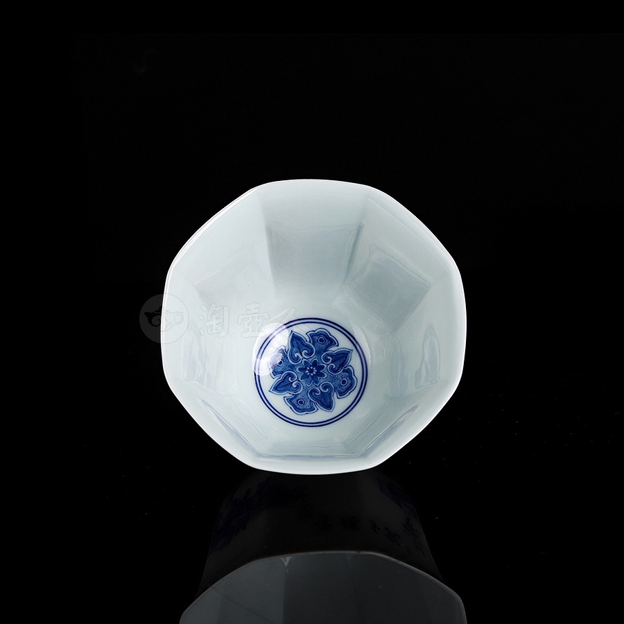 此杯取八方之形,棱线经圆化处理,刚柔相济,执握舒适不硌手,口沿外撇舒展,圈足高挺且修削利落,使整器更显挺拔秀雅,轻薄胎骨之上,釉水采用传统吹釉工艺施就,釉层肥厚莹润,如凝脂般均匀覆盖胎体,在光下泛出温润的光泽。