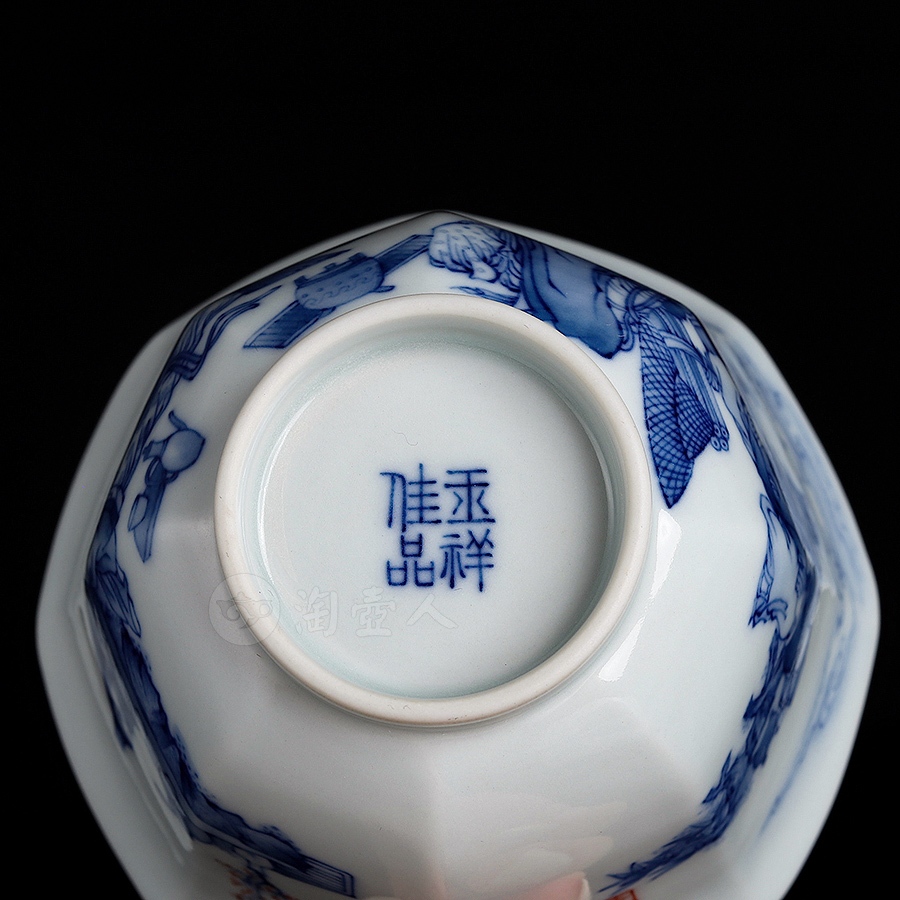 杯身以精湛的青花分水技法绘孔子杏林讲学图,内底则饰如意纹点缀,孔子广袖博带,神情肃穆,弟子或凝神谛听,或执卷沉思,青料浓淡相宜,色阶过渡自然,画面层次分明,既有水墨画的空灵意境,又不失青花瓷的苍翠韵味。人物开脸细腻,须眉传神,衣纹流畅飘逸,较之市面上常见的花鸟山水题材,更显画工之精湛,实为当代青花人物画之典范。