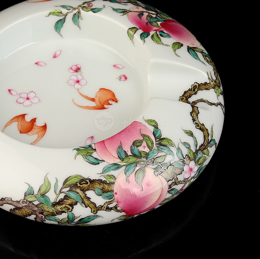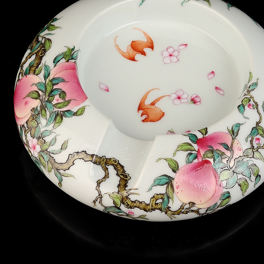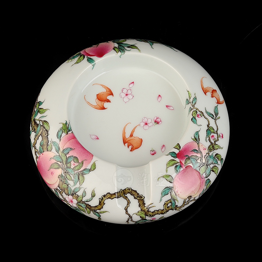 此件烟灰缸,特邀从业十五载以上的资深画师匠心执笔,悉心绘就寿桃与蝙蝠纹样。寿桃自古为长寿之征,蝙蝠则因 “蝠” 与 “福” 谐音,暗含吉庆之喜,二者精妙相融,凝练出 “福寿双全” 的美好祈愿。