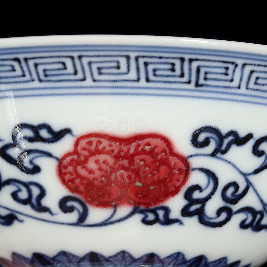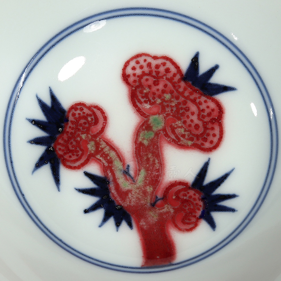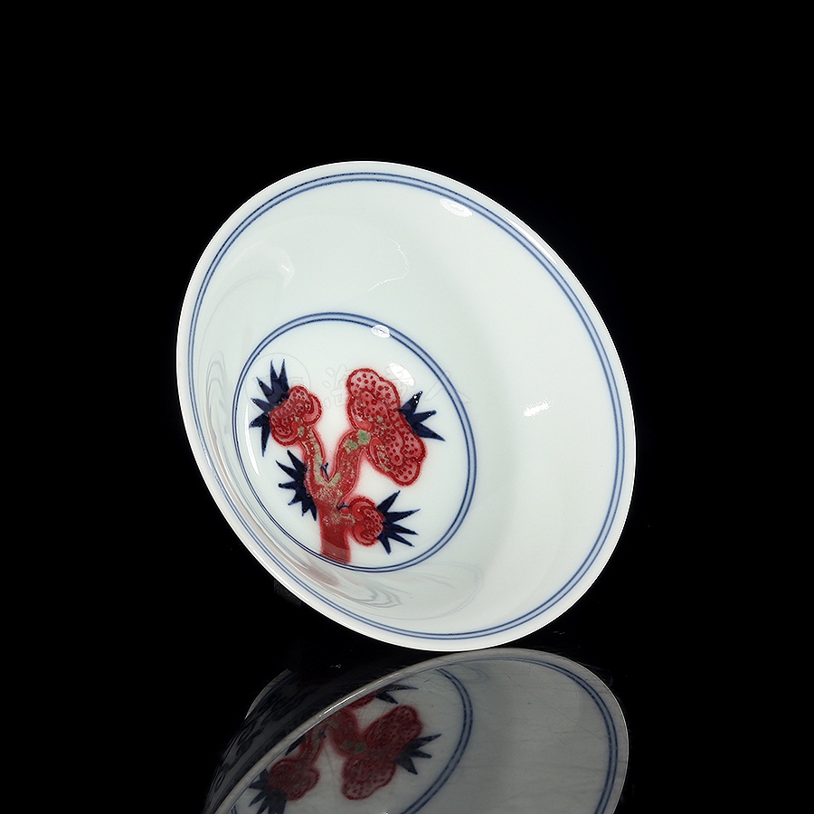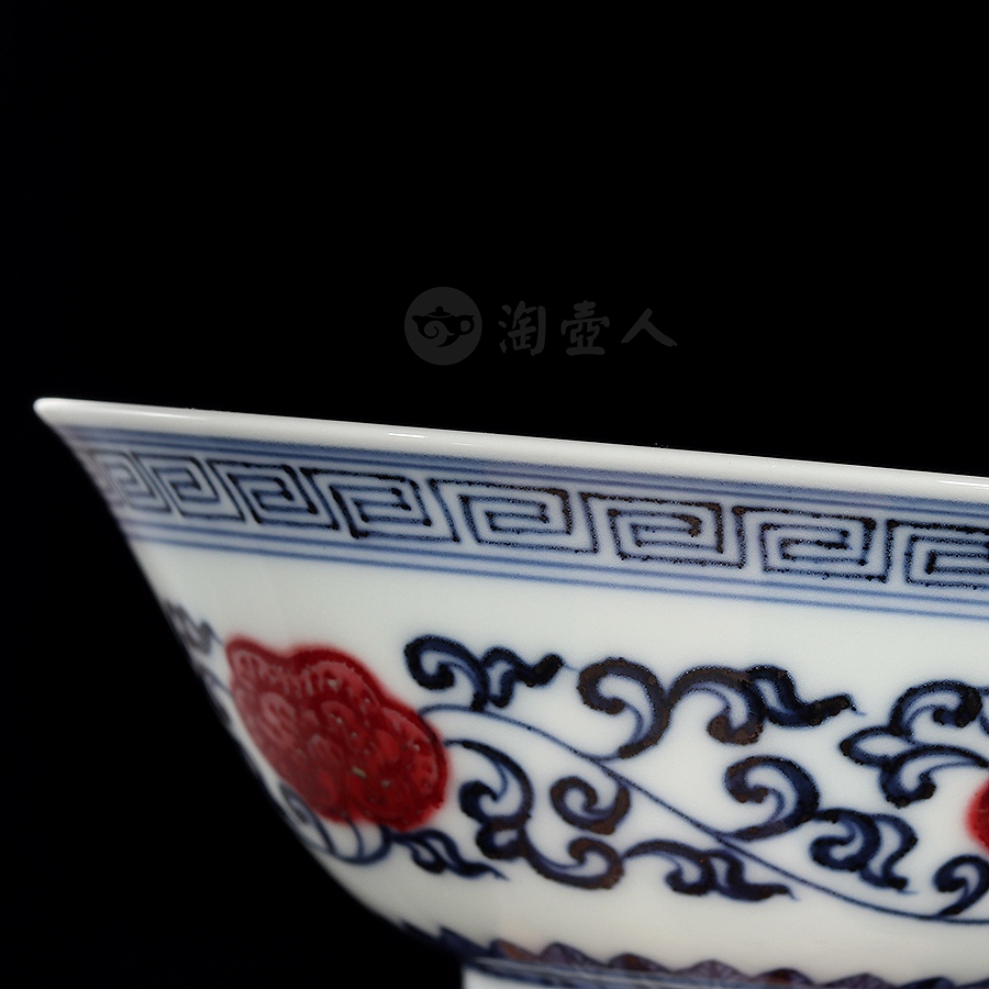 青花之雅,恰能弥补釉里红呈色层次变化的细微不足,釉里红之艳,又为青花瓷的素净增添了鲜活色彩。二者相融相生,青如远山含黛,红似丹枫映霞,清雅与妖娆并存,深沉与热闹共生。最终在这方寸盏身之上,达成幽靓雅致与浑厚壮丽的完美平衡,将中式美学的和谐之境展现得淋漓尽致。
