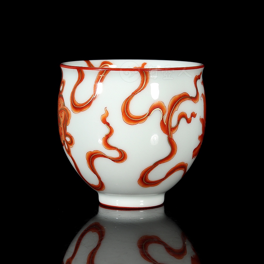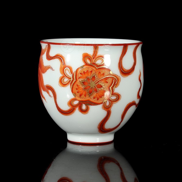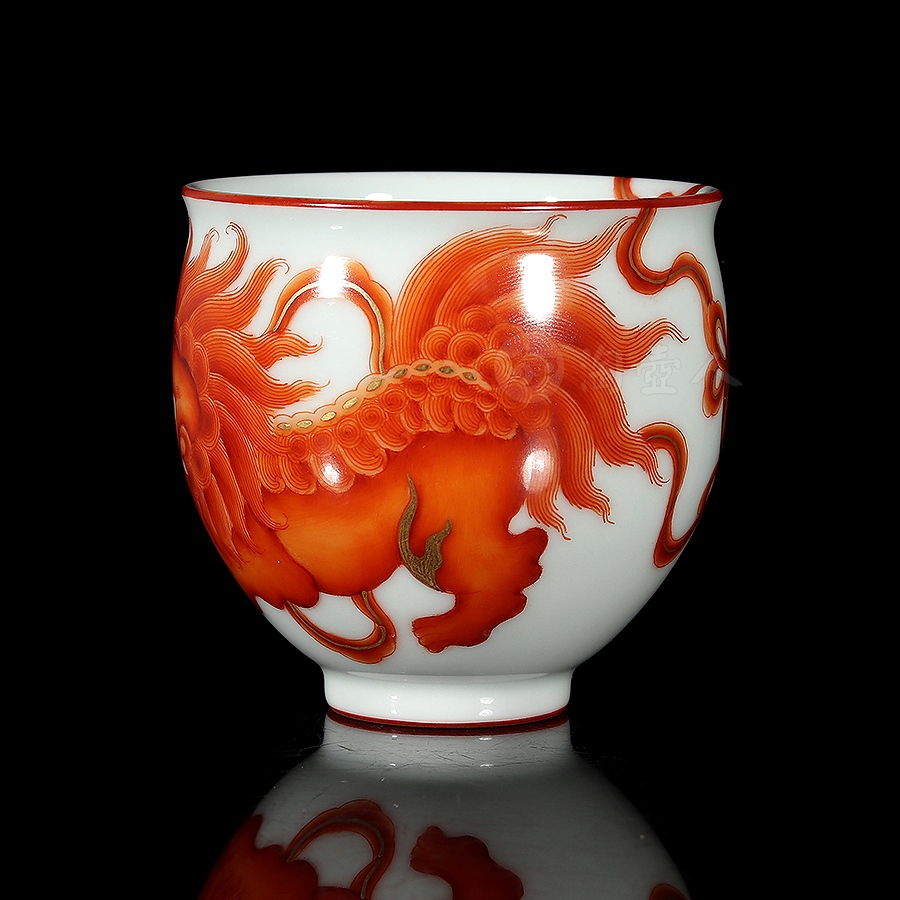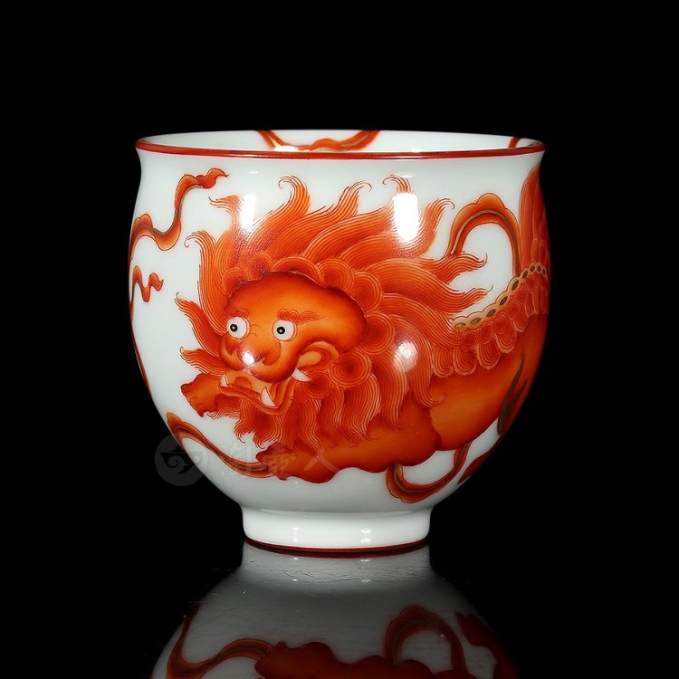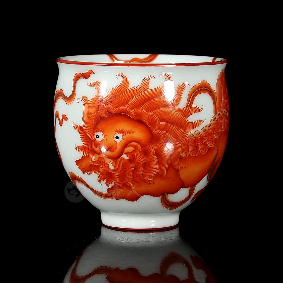 此件龙蛋杯,制式作蛋形,高身设计搭配内敛束颈,腹身饱满圆润,下承挺拔高圈足,整体比例协调,杯身采用传统矾红彩工艺,辅以精细描金技法,全手工勾勒狮戏绣球纹,一笔一画都饱含匠心。