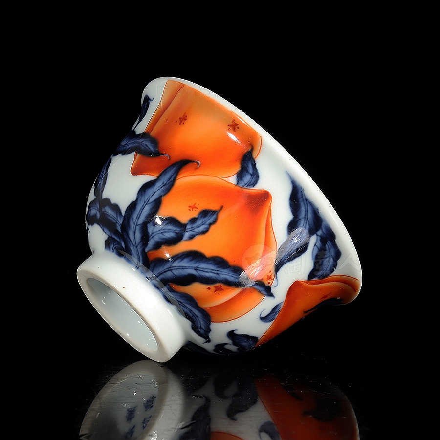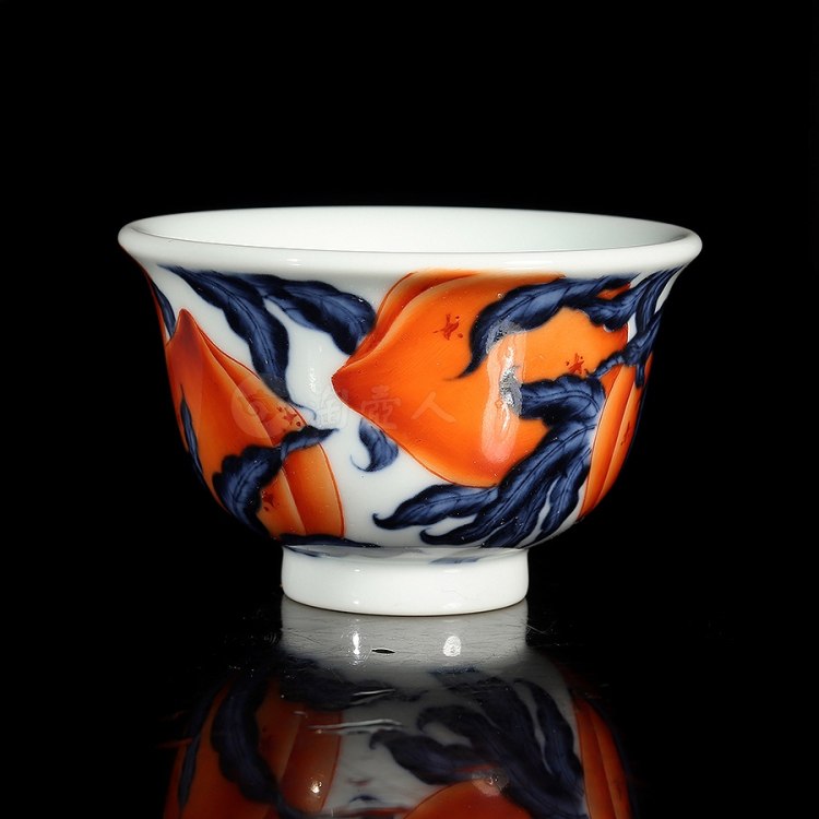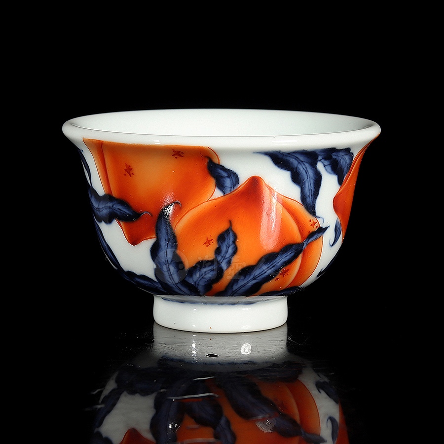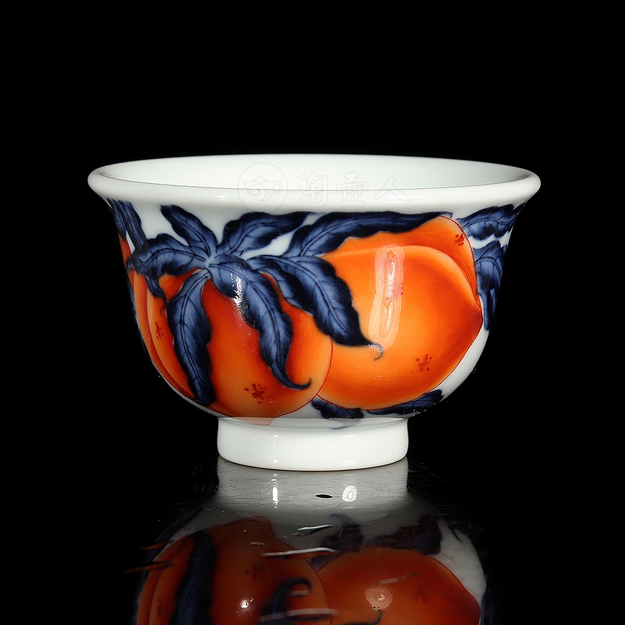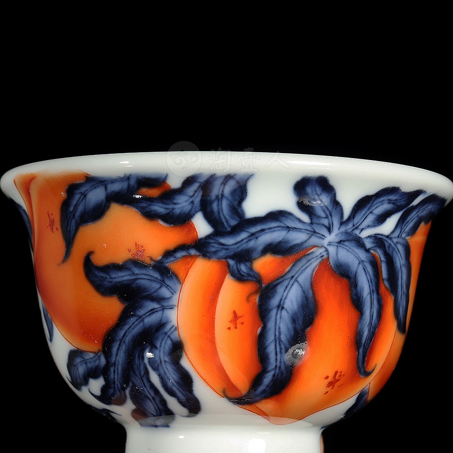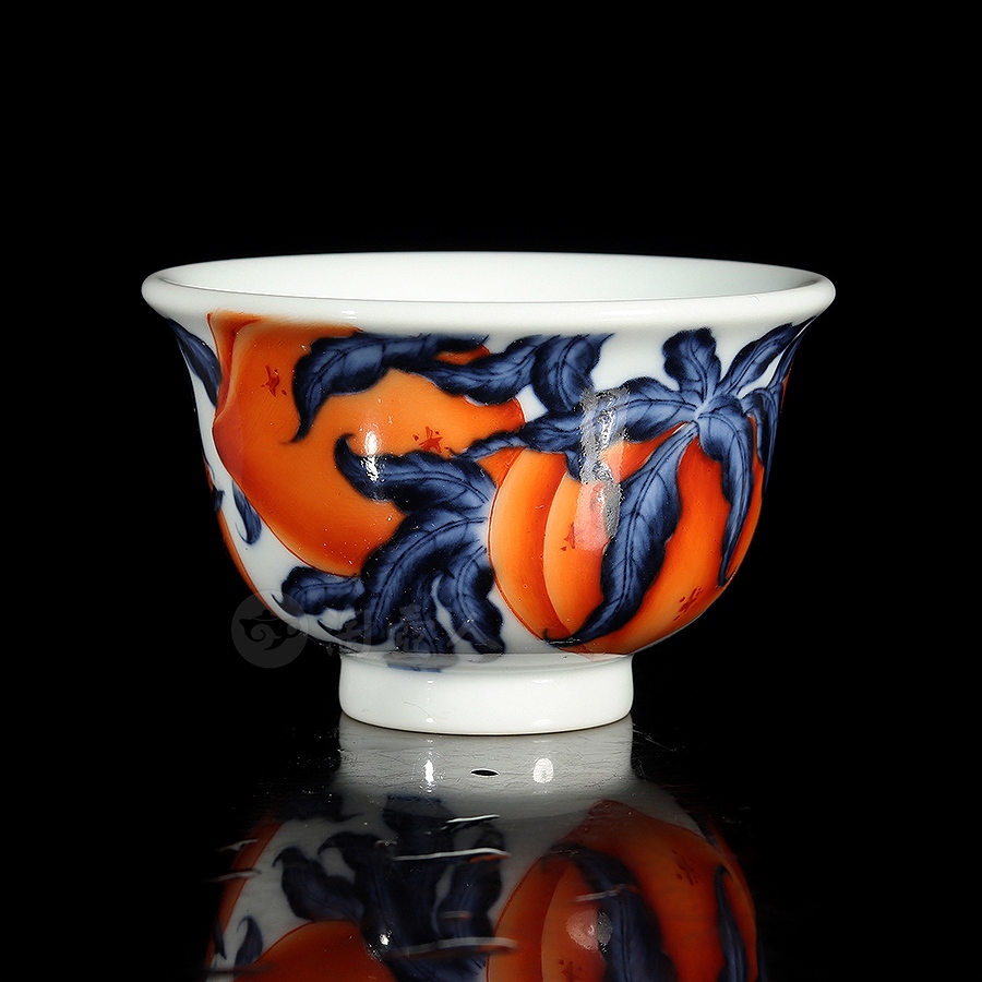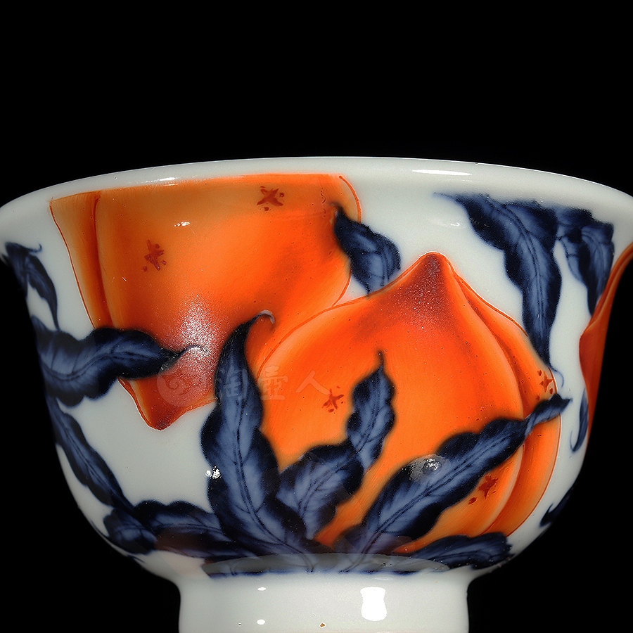 首页 品茗杯 梁峻窑制《青花矾红寿桃压手杯》