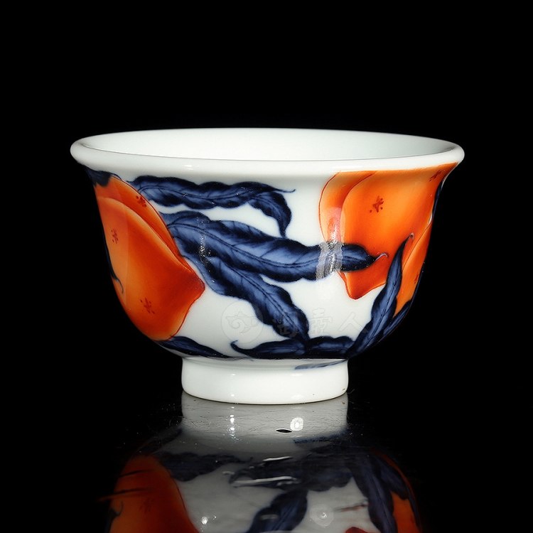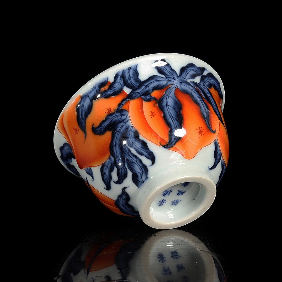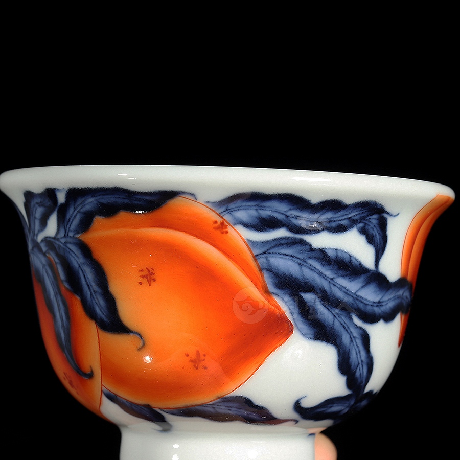 杯身外壁采用青花矾红技法精心绘制寿桃纹样,青花勾勒桃叶,矾红填色桃果,色泽鲜亮明快,与青花的清雅形成对比,寿桃形态饱满鲜活,叶片舒展灵动,笔触细腻入微,尽显生机。整器工艺精湛,纹饰吉祥,兼具实用性与观赏性。